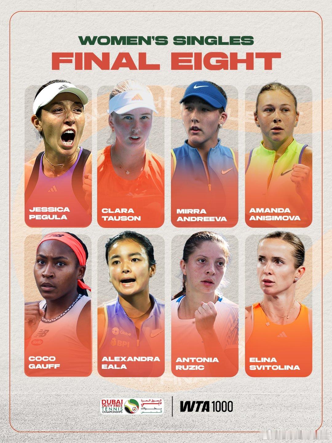 迪拜1000赛八强,四强会是?[L]鲁季奇🇭🇷 vs 斯维托丽娜🇺🇦高芙🇺🇸 vs 伊埃拉🇵🇭[12]陶森🇩🇰 vs 佩古拉🇺🇸安德列娃🇷🇺 vs 阿尼西莫娃🇺🇸这很澳网