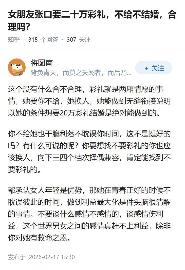 女朋友张口要二十万彩礼,不给不结婚,合理吗?