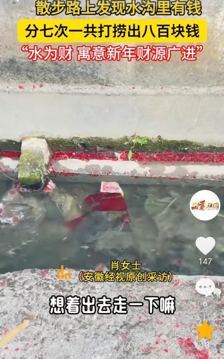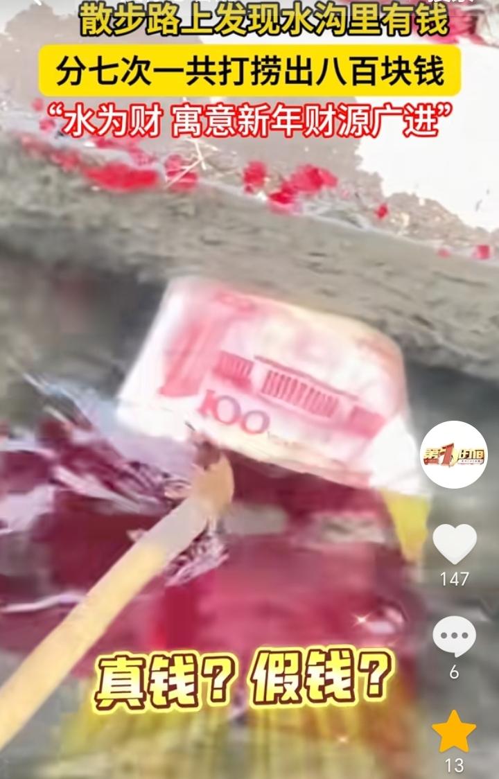 运气太好了!广东,女子外出散步,发现水沟里面有钱,仔细一看还不止一两百,也不知道是真钱还是假钱,接着女子就找来了一根竹竿,分了七次小心翼翼的打捞出了800元,而且都是真钱,女子表示,非常的幸运和开心,俗话说“水为财,寓意新年财源广进”。 这运气真是逆天了,出门竟然就捡到钱了,而且一次就是800元,这不得高兴好几天,运气这么好,应该直接去刮奖买彩票,说不定能中大奖。 真是运气来了挡都挡不住,女子新的一年开始出门就捡钱,寓意着她今年整年肯定都会一帆风顺发大财。