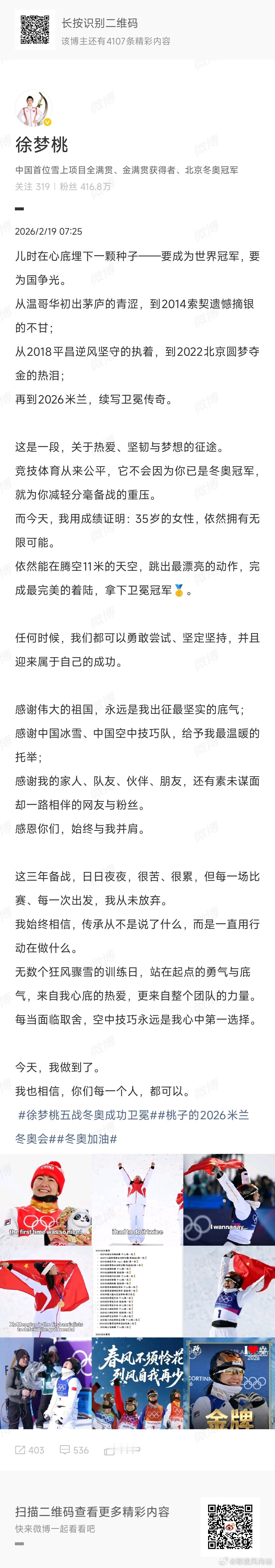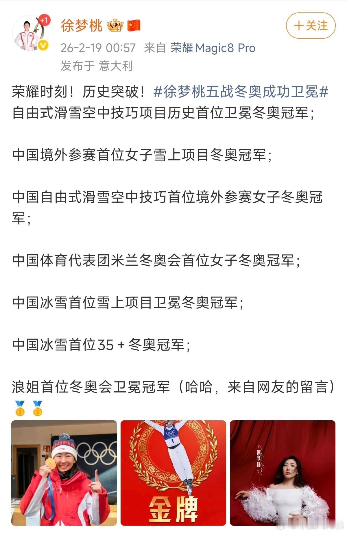 徐梦桃已争气争气再争气徐梦桃荣耀时刻历史突破徐梦桃五战冬奥,争气再争气!从北京到米兰,她用35+的热血卫冕,成为空中技巧历史首位卫冕冠军。每一次腾空,都是对热爱的注解;每一枚金牌,都是对坚持的礼赞。这就是中国冰雪的底气,这就是徐梦桃的传奇。