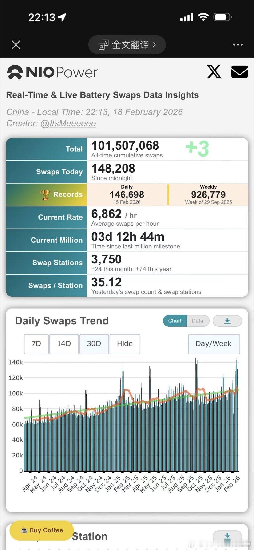 昨晚十点半 海外网站统计的换电次数已经超过前高(年前返程)今天官方发的海报显示新高为 158290 次