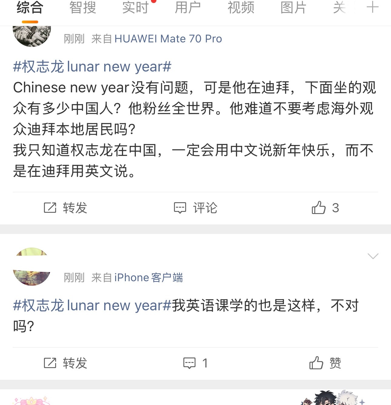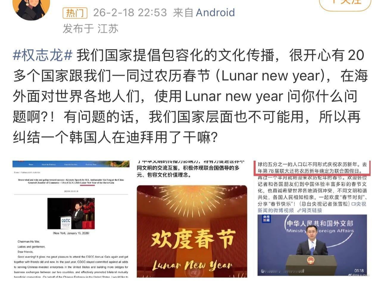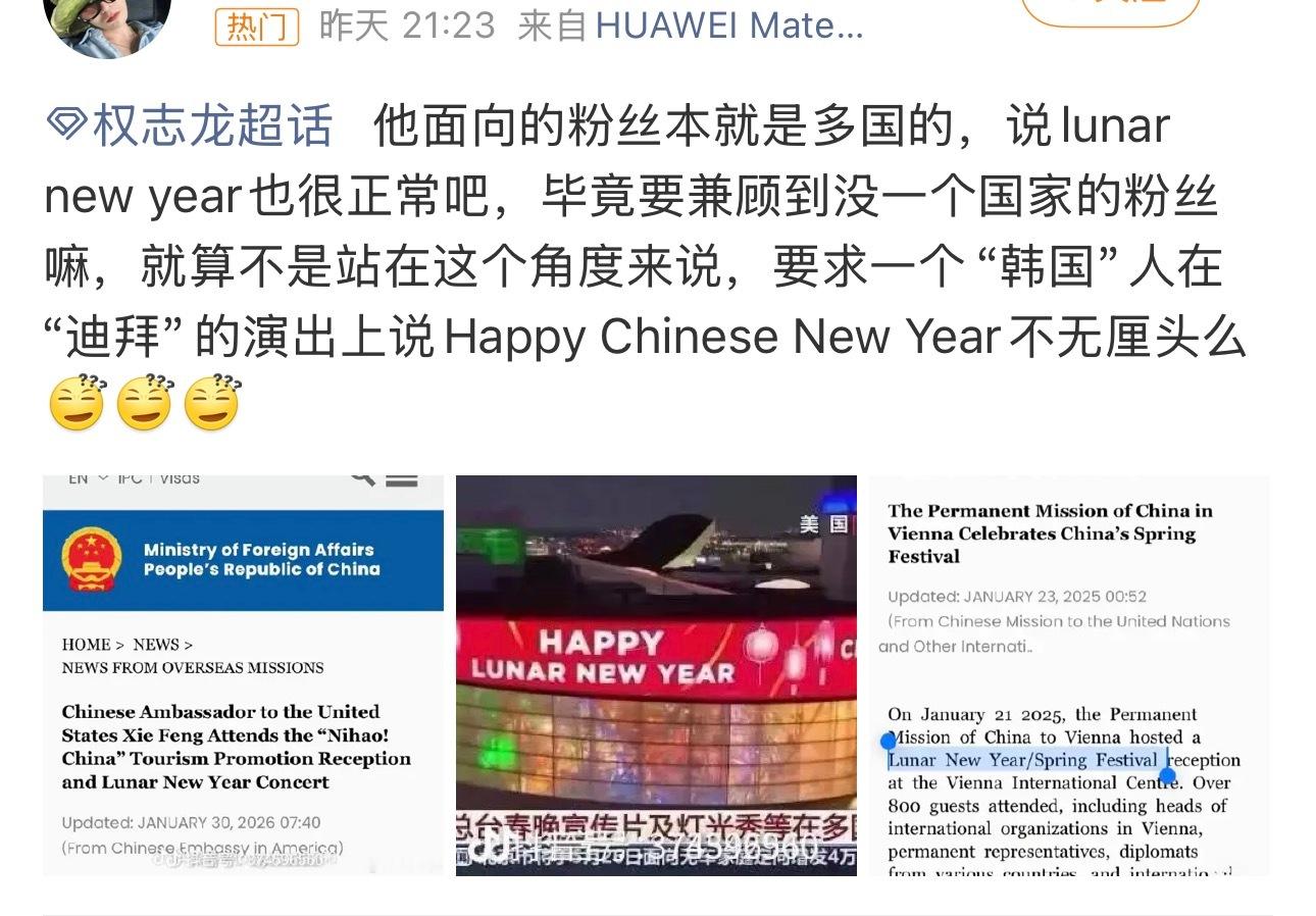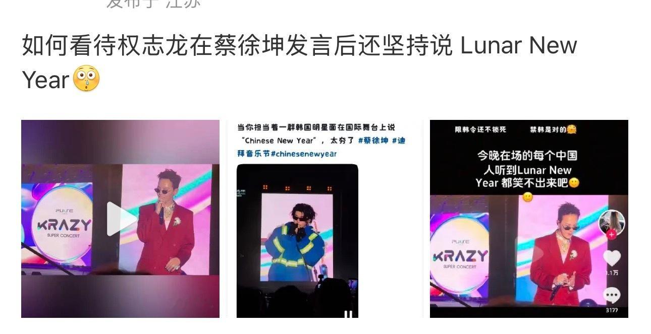 lunar new year和Chinese new year的争论一直存在,公众人物不可能不知道, 更何况前面发言的蔡徐坤也说了Chinese, 这时候说lunar就是想说没有别的理由。