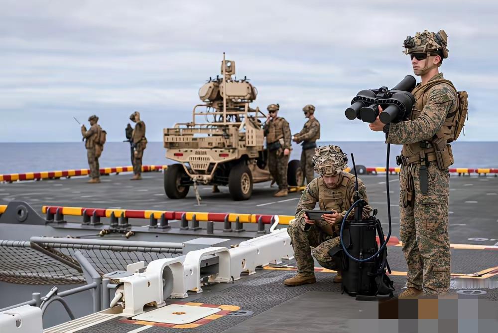 为了解决两栖攻击舰的防空死角问题,美军也是陆炮上舰了。 把这种小巧玲珑的反无人机轻便车,拉到了攻击舰的甲板上,为的就是提供反无人防空的保护。 这个主意真是好,这种车可以是移动的,部署几辆车,就可以组成一个防空反无人机网了。