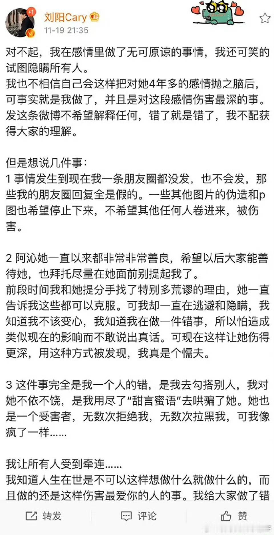 半藏森林曾发文承认插足