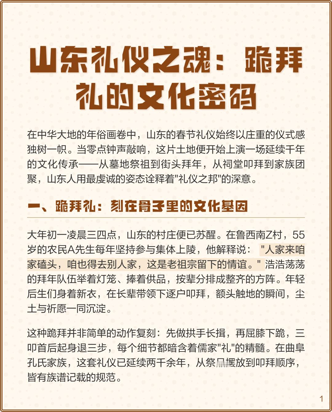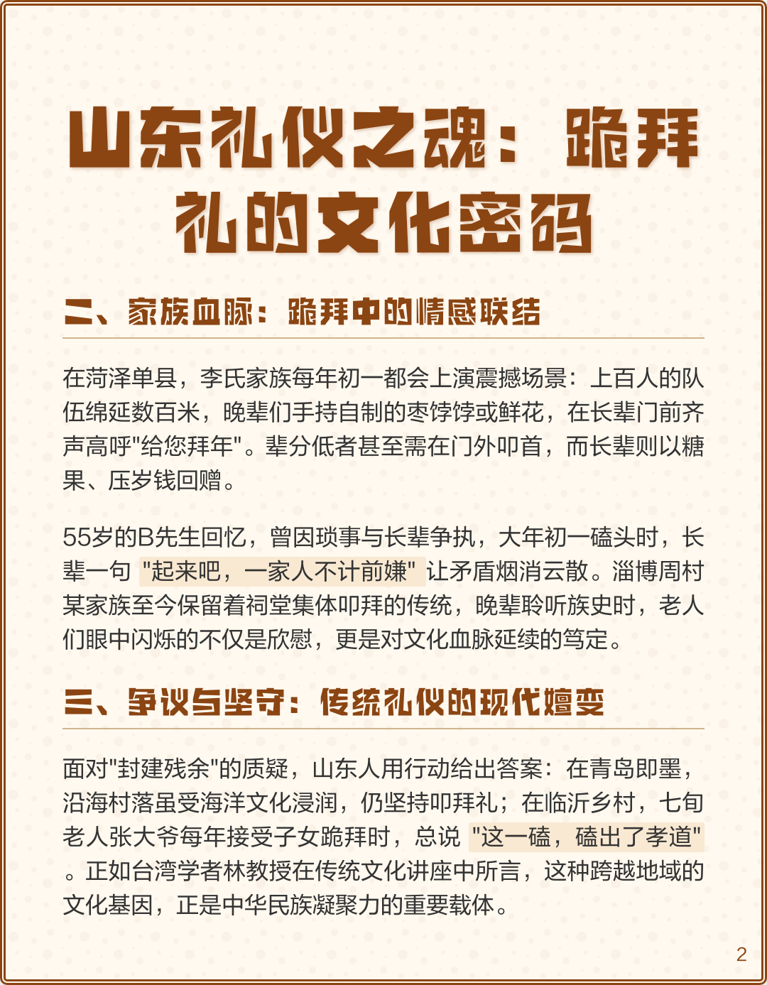 台湾教授跨越海峡回山东老家过年 在中华年俗版图中,山东春节礼仪以庄重仪式感彰显独特文化基因。当零点钟声划破夜空,这片土地便开启千年传承的礼序华章,从宗祠祭祖到街巷拜年,从叩首礼揖到阖家守岁,山东人用身体力行诠释着"礼仪之邦"的精神密码。