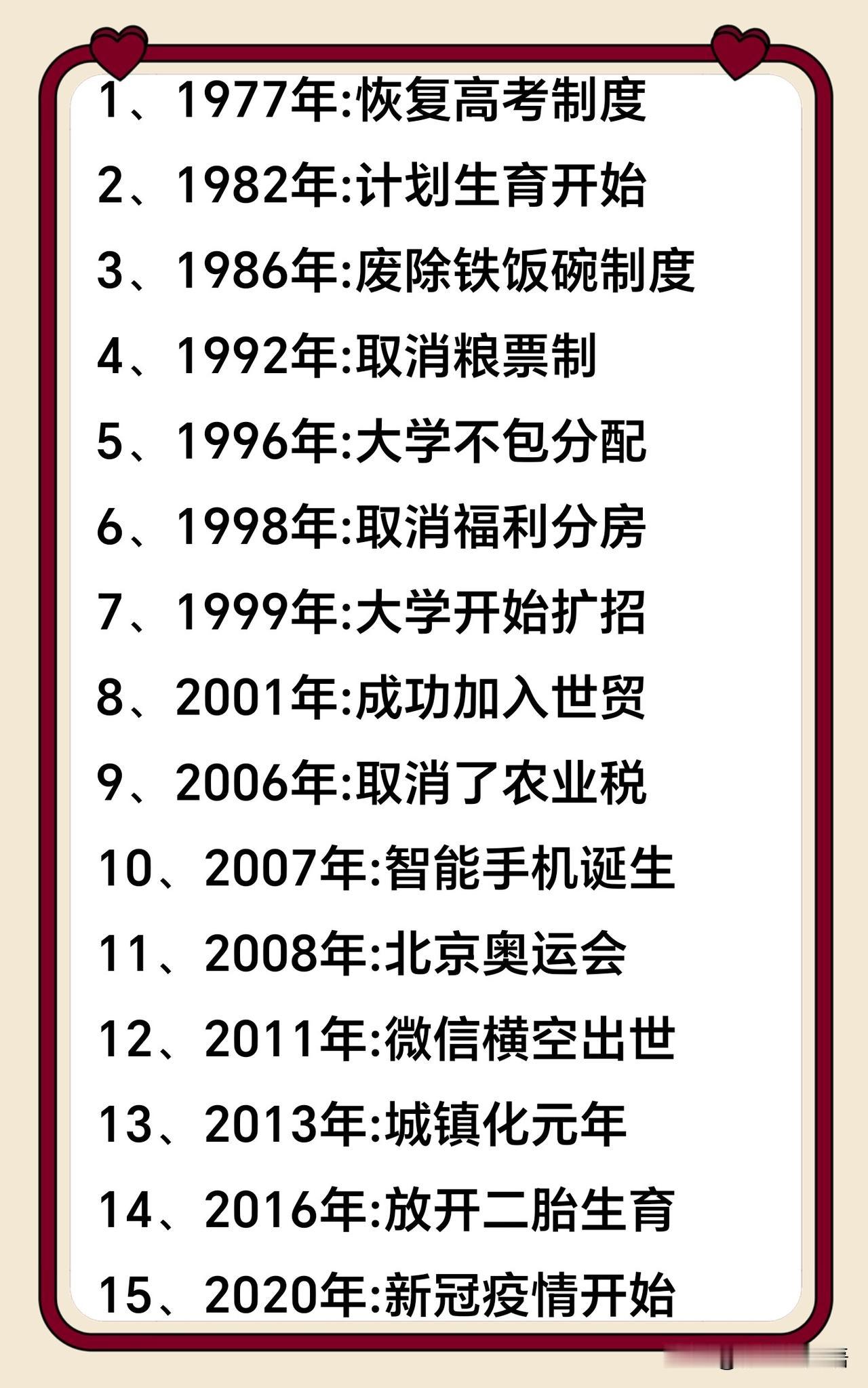 董宇辉最大气的一句话“你要看的世界,远比你想的近”。的确,有些事,看着是国家大事,其实每一件,都在悄悄影响我们的工作、生活、未来和钱袋子。现在,只需要你一句真话:以下这15件大事,哪一件事影响力最大、最深远,至今还在深刻影响着你的切身生活? 不必犹豫,评论区留下你的答案,敢说出来代表您善于思考。 1、1977年:恢复高考制度 2、1982年:计划生育开始 3、1986年:废除铁饭碗制度 4、1992年:取消粮票制 5、1996年:大学不包分配 6、1998年:取消福利分房 7、1999年:大学开始扩招 8、2001年:成功加入世贸 9、2006年:取消了农业税 10、2007年:智能手机诞生 11、2008年:北京奥运会 12、2011年:微信横空出世 13、2013年:城镇化元年 14、2016年:放开二胎生育 15、2020年:新冠疫情开始 董宇辉金句良言 董宇辉 你关心国家大事吗? 董宇辉带货技巧 董宇辉爆点精句