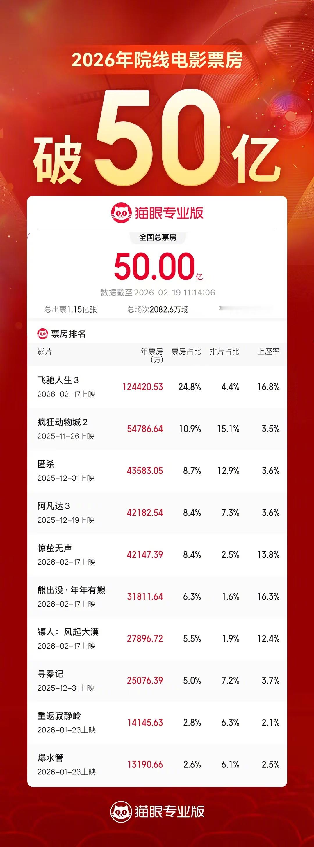 2026年度总票房破50亿据猫眼专业版数据,截至2月19日11时15分,202