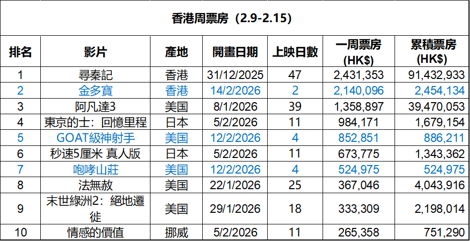 2026年第7周香港票房 :1.《寻秦记》在加长版的刺激下继续稳坐冠军,累计票房9143万排名香港影史第18;2.《金多宝》开画成绩不错。(数据:香港贸发局)