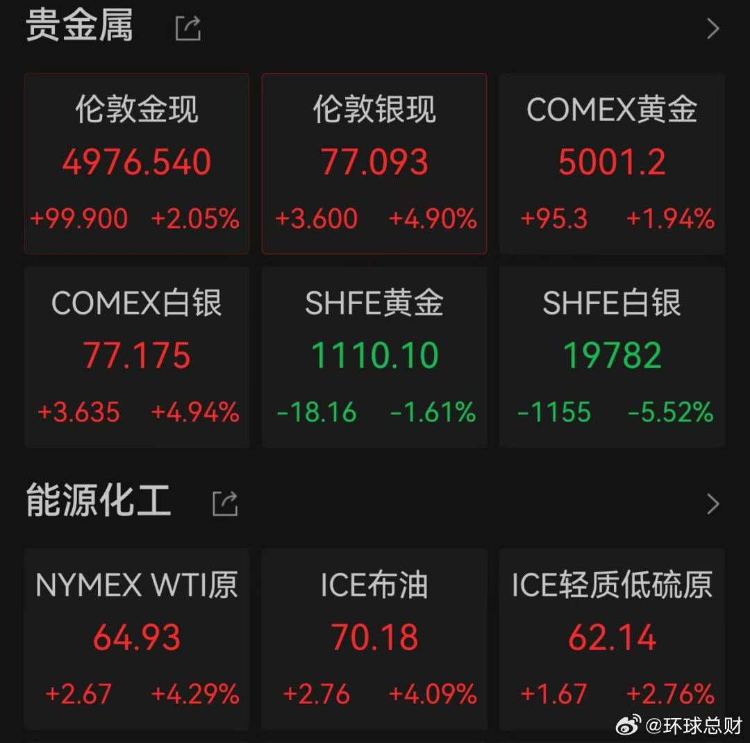 #金价重返5000美元##银价飙涨# 大宗商品市场方面,贵金属价格、油价携手上涨。