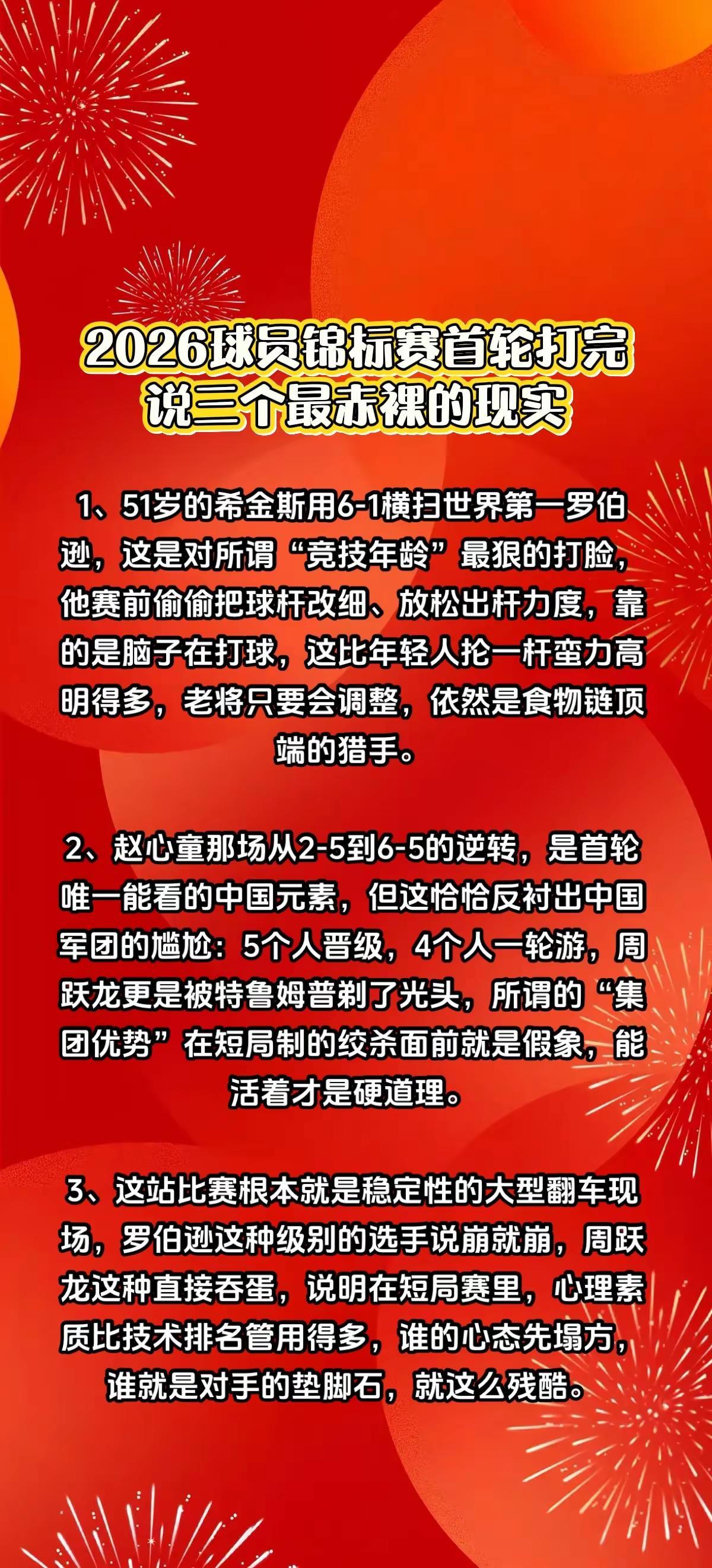 2026球员锦标赛首轮后,三个现实很打脸。斯诺克
