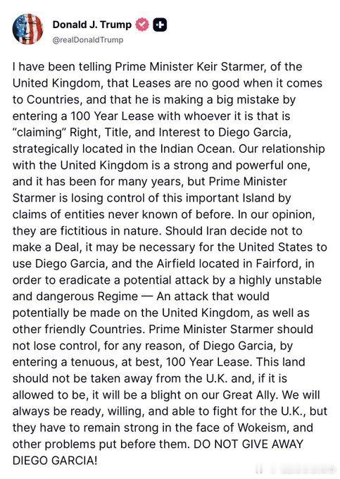 我一直在告诉英国首相基尔·斯塔默,关于国家事务,租约是不可靠的,他与某些“声称”对位于印度洋战略位置的迪戈加西亚岛拥有权利、所有权和利益的实体签订 100 年租约 是一个重大错误。