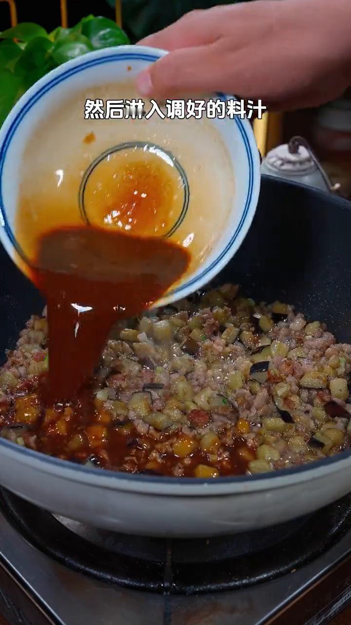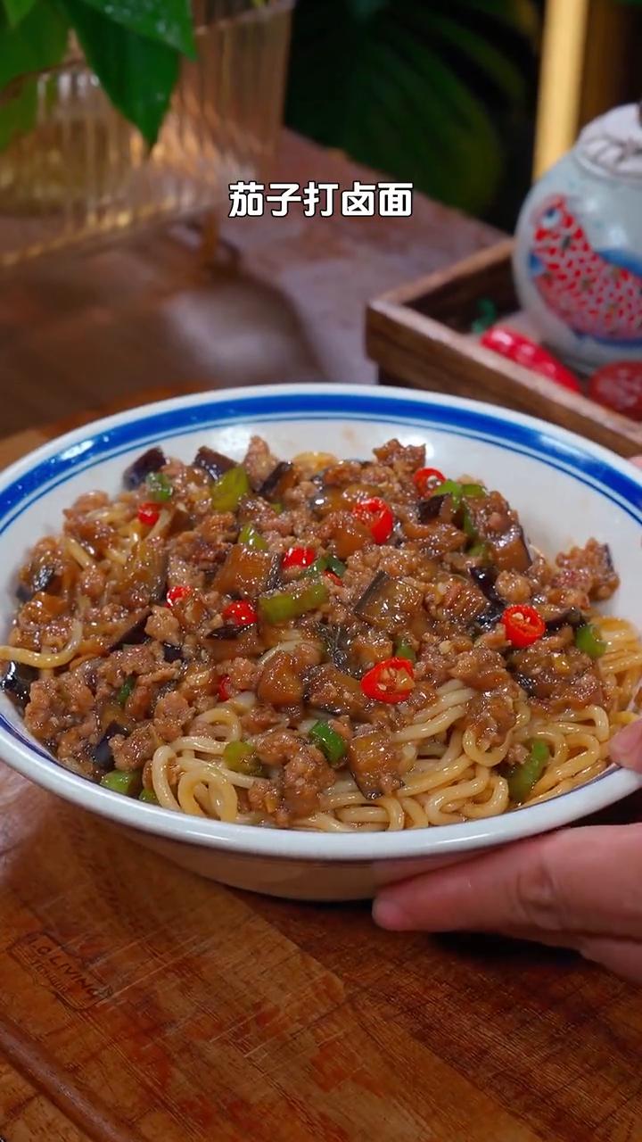 茄子打卤面。 以后想吃面条了,就像我这样做一个茄子打卤面,酱香浓郁,简单又好吃。 ·首先将茄子切成小丁,加一勺盐,抓拌均匀后杀出多余水分。 ·调碗中放生抽、老抽、些许蚝油、一勺豆瓣酱、盐和鸡精、一勺白糖、一勺水淀粉,搅拌均匀调个酱汁。 ·油热放7毛钱的肉末,炒至变色,加葱、姜、蒜,倒入切好的茄子,慢慢炒软。 ·淋入调好的料汁,翻炒均匀,放点青红椒。 ·最后用大火收浓汤汁,浇在煮好的面条上即可。 酱香浓郁,每根面条都裹满了酱汁,真的太香太好吃了。