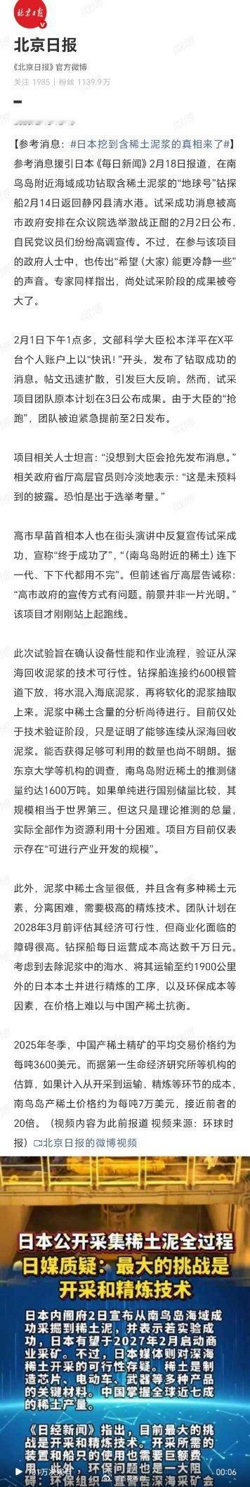 日本挖到含稀土泥浆的真相来了这是一场精心策划的政治秀,终究难掩其经济上的苍白。日本政客将尚处技术验证阶段的试采成果,当作选举“快讯”高调宣扬,实属闹剧。且不说稀土含量、分离技术等重重难关未破,光是每吨高达7万美元的成本(约为中国的20倍),就足以让这所谓的“天量宝藏”沦为昂贵且无用的海底泥巴。画饼无法充饥,与其沉迷于这种自欺欺人的宣传,不如脚踏实地面对现实。
