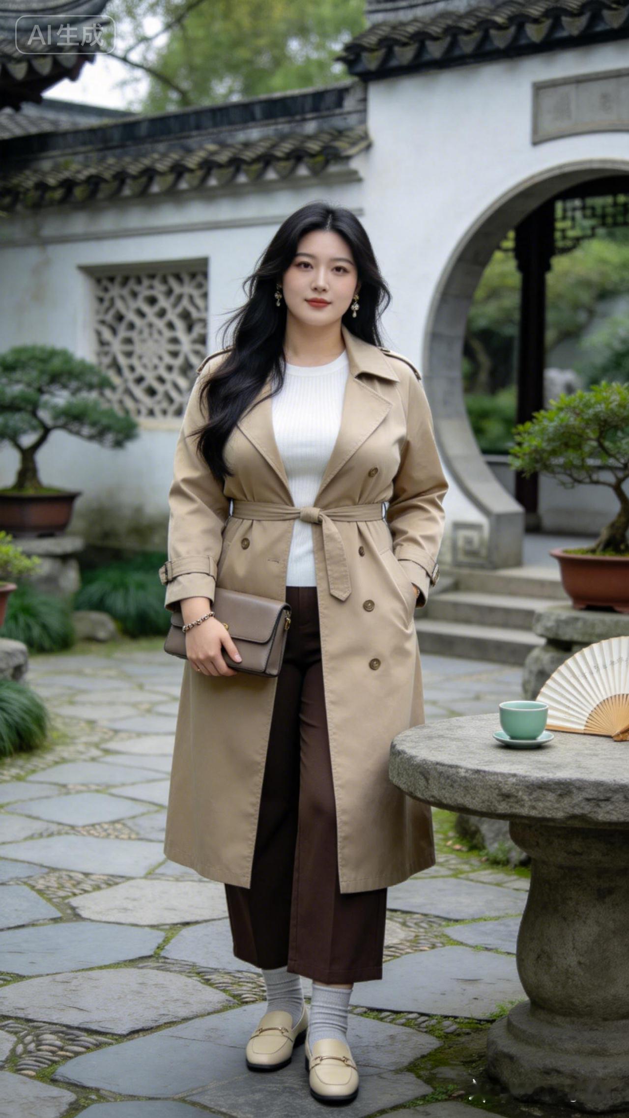 优雅漫步在古风庭院,米色风衣与棕色长裤的完美搭配,尽显都市女性的时尚与优雅。