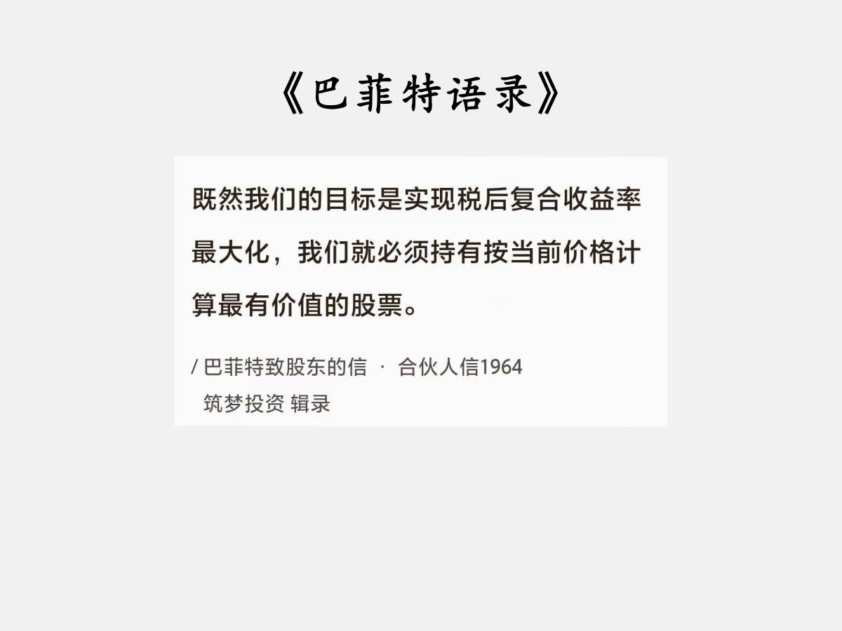 No.188 股神巴菲特谈“最有价值的股票” 巴菲特曰:“既然我们的目标是实现税后复合收益率最大化,我们就必须持有按当前价格计算最有价值的股票。” 唯一不变的是变化本身,而股市唯一不变的是波动。 市场先生就像个永动机,只要是交易日,它就一刻不停地报价。涨跌起伏,红红绿绿,波动是股市常态。 无论投资什么,价格都是绕不过去的最关键要素。而面对无时无刻都在报价的股市,我们手里股权的安全度和回报率也会随之而动。 比如一家优质上市公司,未来十年的折现值是每股200元。上个月的收盘价是120元,今天收盘价是160元。 很显然,它上个月卖的更便宜,安全度更高。 而上个月120元的它,其潜在回报至少有每股80元,而今天160元的它,潜在回报只剩下了每股40元。孰高孰低,一目了然。 投资追求的是安全基础上的税后利润最大化。 所以,面对始终波动的股市,我们要实时监测手里股权,把安全度、回报率变低的股票踢出去,换成更具价值的股权。 我们要始终与能懂的最安全、回报最丰厚的股权为伍。