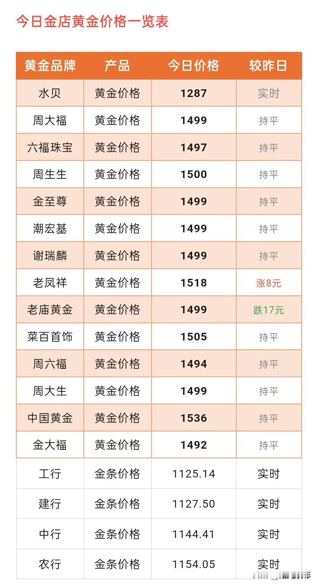 金价查看!大年初三,(2026年2月19日)各大品牌黄金门店报价!以及黄金行情主要分析! 那么来看看,今天各大品牌黄金门店金饰品价格分别为多少钱一克了? 周大福黄金价格1499元/克,六福珠宝黄金价格1497元/克,周生生黄金价格1500元/克,老凤祥黄金价格1518元/克,老庙黄金黄金价格1499元/克,菜百首饰黄金价格1505元/克。 同昨天(2月18日)各大品牌黄金门店报价相比较,今天有两大黄金门店金饰品价格数据显示一涨一跌形势。 先来看看上涨黄金门店是哪个? 是老凤祥,上涨了8元/克, 再来看看下跌的黄金门店是哪个? 是老庙黄金,下跌了17元/克。 另外其它,周大福、六福珠宝、周生生、金至尊、潮宏基、谢瑞麟、菜百首饰、周六福、周大生、中国黄金、金大福同昨天报价保持一致。 根据黄金价格网消息: 2026年2月19日亚市,现货黄金窄幅震荡于4960-4990美元/盎司区间,延续高位整理态势。 隔日,黄金白银大涨,现货黄金一度攀升至5010美元,最终收涨2%报于4976.09美元,现货白银收涨5%报于77美元上方。 截至11时50分黄金实时行情:伦敦现货黄金报每盎司4980美元,美黄金报每盎司5001美元,伦敦现货白银报每盎司77.8美元,美白银报每盎司77.8美元。 国内实时金价1104元/克,白银实时价格19.2元/克,铂金实时价格471元/克。 有关汇丰银行首席贵金属分析师詹姆斯·斯蒂尔表示: 黄金是避险资产并不意味着价格就不会波动,2026 年市场波动或将是贵金属市场的主要特征。 下一任美联储主席凯文·沃什表达了缩减美联储资产负债表态度是对国际金价的持续利空影响,美联储需要保持其专业独立性,否则将反过来推升国际金价。 在可预见的未来,美元仍将作为全球的储备货币,但各国央行降低美元风险敞口的方式之一就是增加黄金储备。 最后来分享个购买黄金饰品注意5要点,买金不踩坑。 1: 不必执着大品牌。足金首饰不一定非选大品牌,只要是足金小品牌或普通金店也可以,款式差异不大,还能省不少钱,毕竟大品牌金价和工费偏高。 2: 认准足金标识。买的时候别只看款式,一定要看钢印标有AU 999、G999和足金999的才是足金指标,不用追求4个9、5个9的纯度,回收时和3个九的价格一样。 3: 按克购买更划算。黄金要按克卖,别买一口价,单价高,后续货款只能换一口价款式,可能还要补钱,再优惠也不划算。 4: 慎选带附加饰品的款式。带玉石、珍珠、钻石的黄金款式尽量不买,这些附加饰品容易掉且不值钱,金价可能拉高,专坑不懂行的。 另外,耳钉选弯针不选直针,项链选M扣不选弹簧扣,手镯不选搭扣款和镂空开口款,这些非足金部分也会按足金计价。 5: 提前了解实时金价,上网查一下黄金走势,各品牌和银行的当日金价,做到心里有底。 还有,金店可以砍价,店员可能有内部优惠或员工折扣,你得主动提出要求,不然他们不会主动说,毕竟多买多赚。 记住这几点,买黄金首饰就不会吃亏。 再来分享个黄金首饰保存的方法: 1: 单独存放:用首饰盒里的小格子或独立密封袋分开装,避免和其他饰品摩擦,也能防潮湿。 2: 环境干燥:别放在浴室、厨房等潮湿地方,可在首饰盒里放一小包干燥剂,防止黄金氧化受潮。 3: 长期不戴:先用软布擦干净再存放,避免表面留汗渍或污垢,否则放久了可能暗沉。另外,如果发现黄金表面有轻微发黑,别自己用硬物刮,先试试温和清洁,要是氧化严重或有磨损,直接找品牌售后,他们有专业翻新服务,能恢复光泽。 以上,所有信息,都只是提供参考价值! 购买黄金有风险,投资需要谨慎,不要盲目跟风!