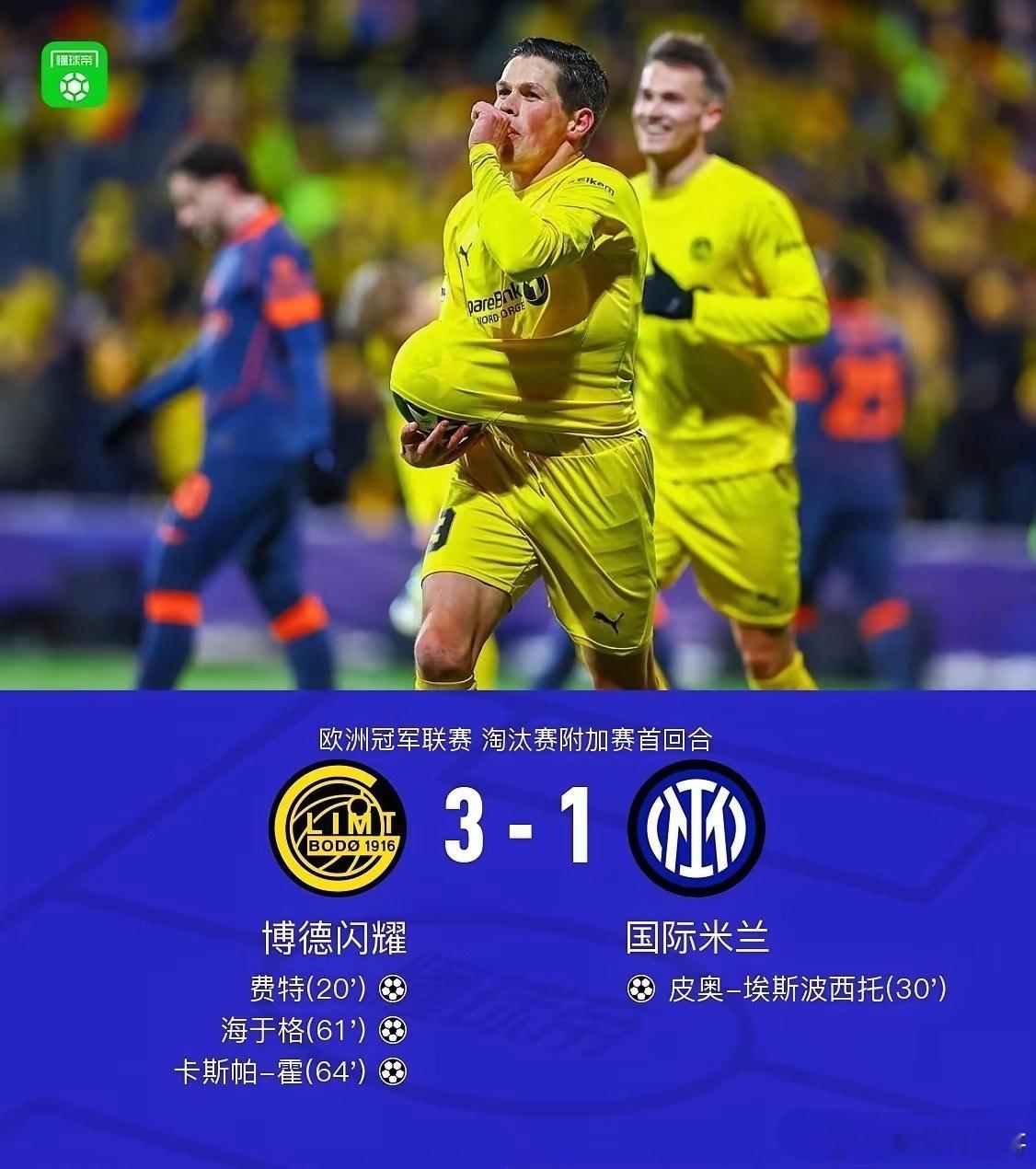 输球伤人,挪威的冬天有点冷。欧洲冠军联赛淘汰赛附加赛首回合,博德闪耀主场3:1战胜国际米兰。上半场,博德闪耀的费特破门,随后,皮奥禁区内劲射扳平比分。但是下半场,国米在三分钟之内连丢两球,海于格和卡斯帕-霍相继破门,最终国米客场1-3不敌博德闪耀,而比赛中,劳塔罗还因伤下场。不知道是不是和尤文图斯一样,国米也受到了巴斯托尼事件的影响,本场比赛明显状态不佳,加上人工草皮的不适应,让国米没能踢出自己习惯的足球。而齐沃本场比赛进行了轮换,左右边翼卫分别上了达米安和奥古斯托,中路也没有首发最近状态出色的泽林斯基,明显能看出来齐沃并没有把本场比赛当做生死战来对待。除此之外,本场比赛运气也不站在国米这边,达米安和劳塔罗的射门都是击中了立柱。一周之后的次回合,国米回到主场,两个球的差距不是不可弥补的,只要全力以赴,一切皆有可能。就看在密集的赛程下,齐沃和国米会以什么态度对待欧冠了。最后想吐槽一下意大利足球,尤文图斯和国际米兰由于巴斯托尼事件,都在随后的欧冠比赛输球,除了自己的比赛中问题以外,相信一定都受到了巴斯托尼事件的影响,这就是典型的意大利足协窝里横的杰作,这回好了,两败俱伤,活该意大利足球衰败。足球欧冠联赛博德闪耀3比1国际米兰