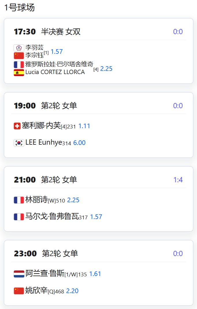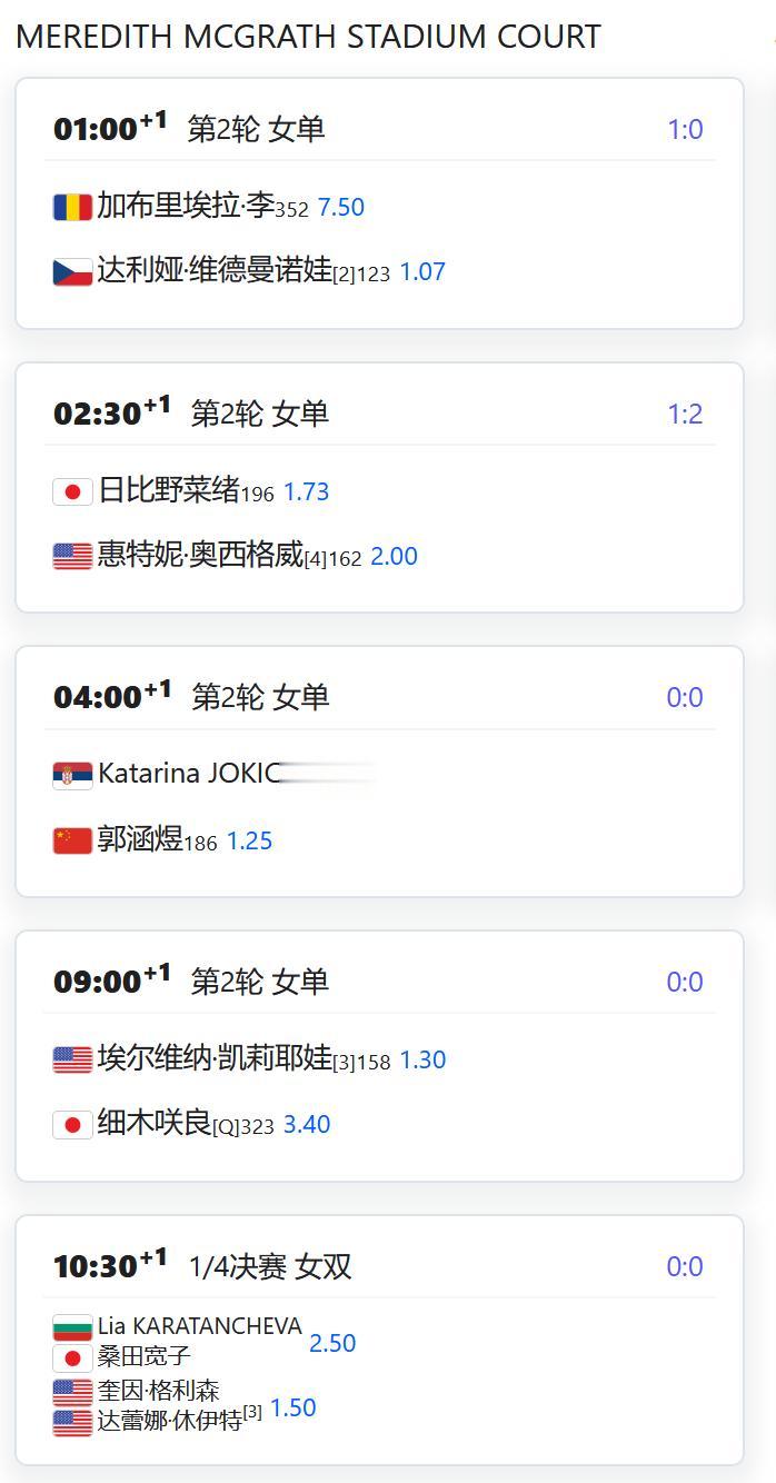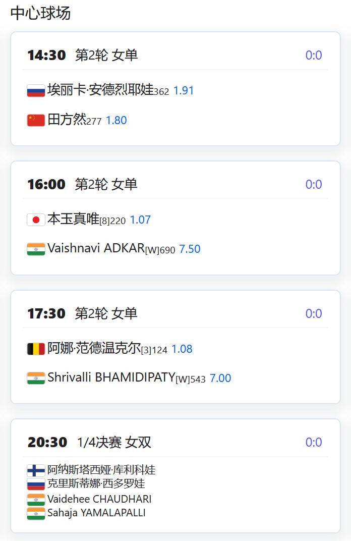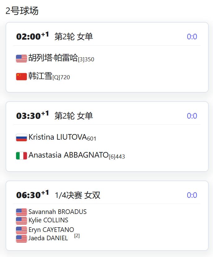 WTA125米德兰,女单第二轮,郭涵煜将对阵塞尔维亚的球员约基奇; 女双四分之一决赛,头号种子汤千慧/圣玛利亚将对阵党一鸣/尤晓迪; W100班加罗尔,女单第二轮,田方然将对阵埃丽卡·安德烈耶娃; W50梅肯,女双半决赛,李宗钰/李羽芸将对阵巴尔塔舍维奇/洛尔塔; 女单第二轮,姚欣辛将对阵头号种子荷兰老将鲁斯; W35拉斯维加斯,女单第二轮,韩江雪将对阵3号种子帕雷哈。