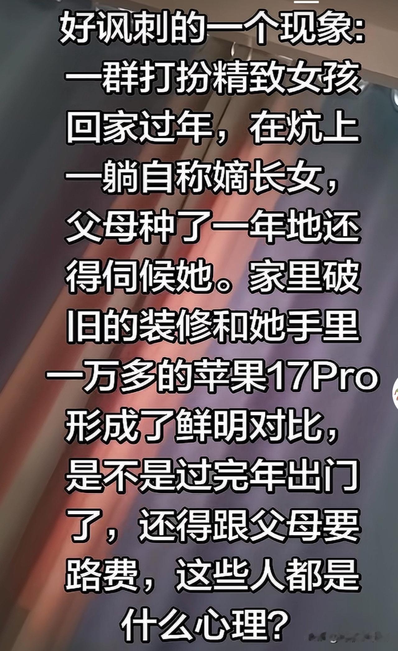 嫡长女文化爆火 这两天刷抖音各地嫡长女文化突然爆火,内容估计大家也都看过了,就是嫡长女在农村大炕上炫耀自己吃各种美食和瑜伽裤,然后睡到12点再起来。 对错没法评说,就是这些嫡长女都这样,要是娶家里估计也是缺乏共情能力,什么都指望别人照顾。