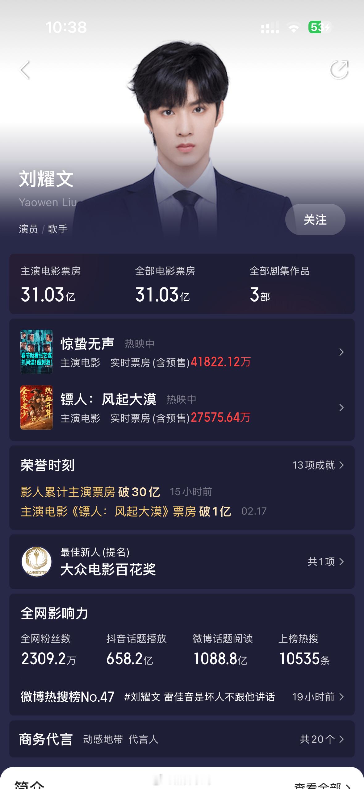 一颗新星冉冉升起刘耀文主演的电影票房破30亿了,家人们相当于每部电影都是10亿起步