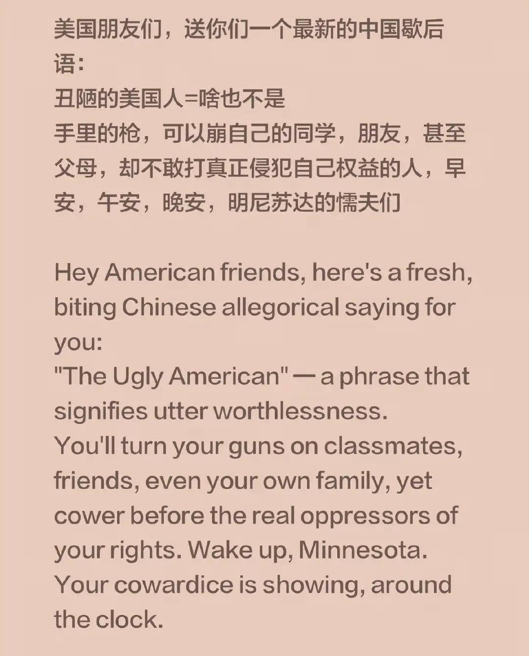 美国人是善良吗? 他们手里的文具在校园里可不是文具啊! 为什么面对ICE的时候,就变成了善良的文具呢? 现在的美国人,就算拿洗洁精洗都洗不干净。 就是一群懦夫。 以前那些公知告诉我们说,美国人因为拥有民间的文具,所以呢,自由平等。 但是现在看来,那些所谓的自由平等,并不是因为能够自由拥有文具而带来的。 因为他们从来就没有过真正的自由和平等。 美国人就像一群待宰的羔羊。 只要真正的屠夫举起了屠刀,这些人全部就跪下来,等待着屠刀落下。 想想其实真的很悲哀。