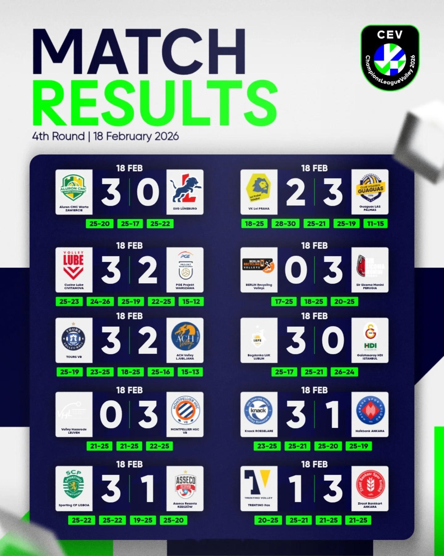 2026男排欧冠 正赛小组赛第6轮比赛结果。