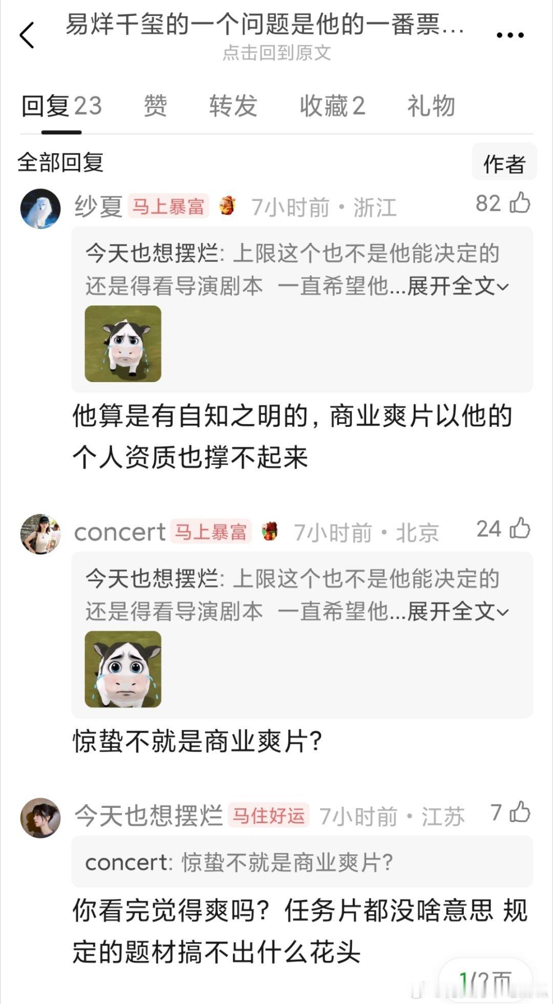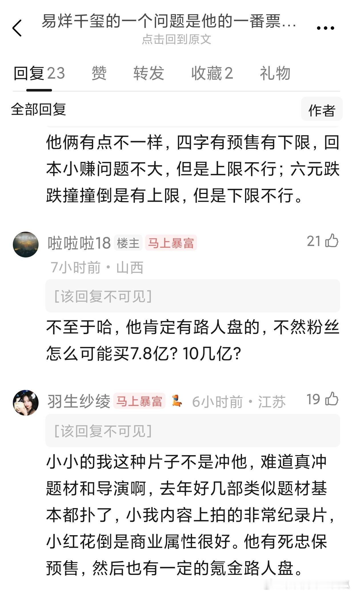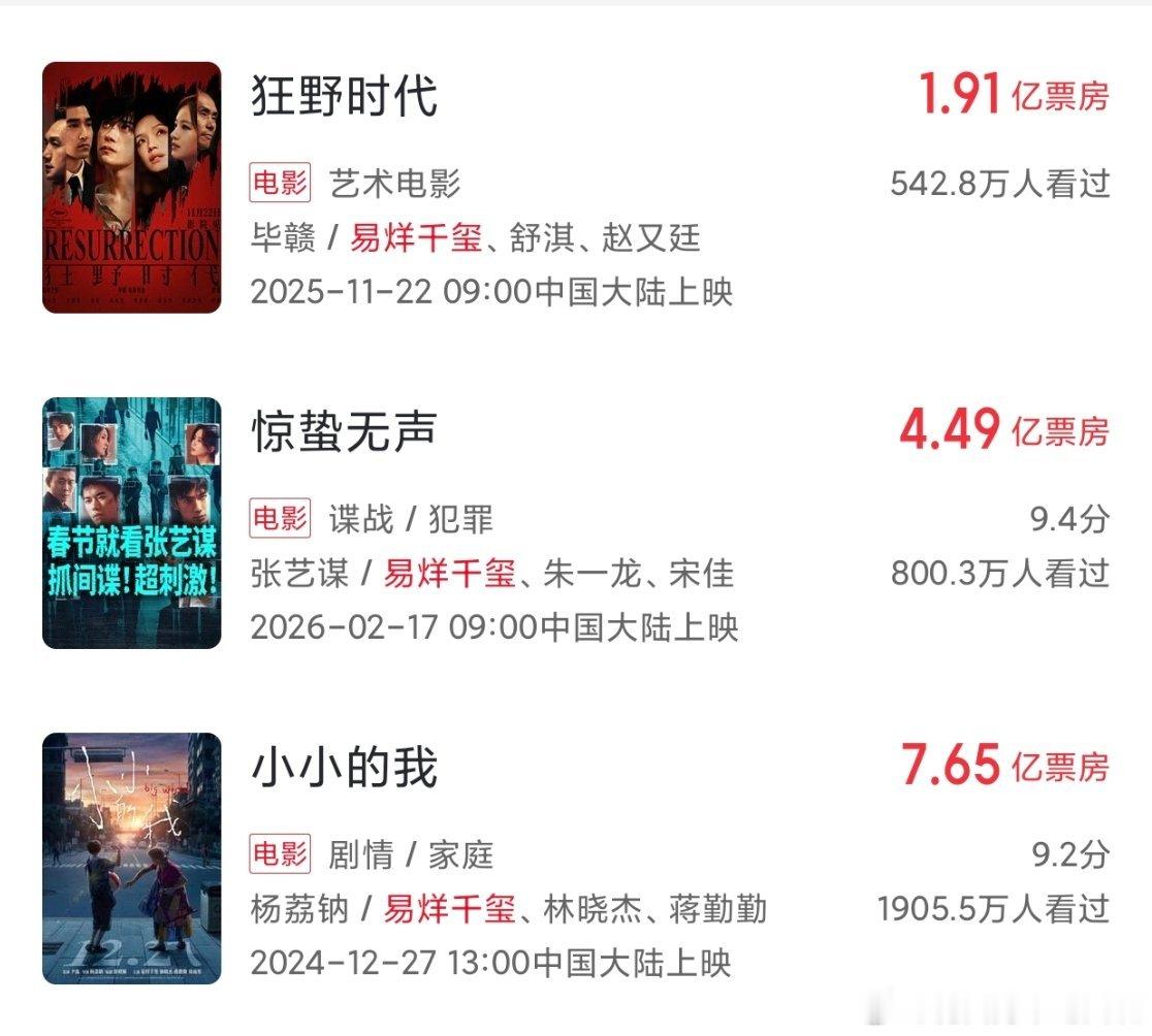 易烊千玺连着两部电影票房不理想,有网友说四字目前最大的问题是一番票房下限高,但上限低,导致陷入了低潮瓶颈期。 你们觉得在理吗?四字目前一番票房最低的《狂野时代》1.9e,底盘算高的。一番最高的《小红花》14e,那还是电影市场最火热的时候,上10亿轻轻松松。而这几年离了吴京、沈腾,票房都没有太高的。《惊蛰无声》预期是超越《满江红》,但剧情太弱走势乏力,总票房能不能破10亿都很难说网友说破解办法是四字尽快需要接一部强剧情的大男主商业片,把粉丝预售转化为实打实的票房号召力惊蛰无声原型惊蛰无声