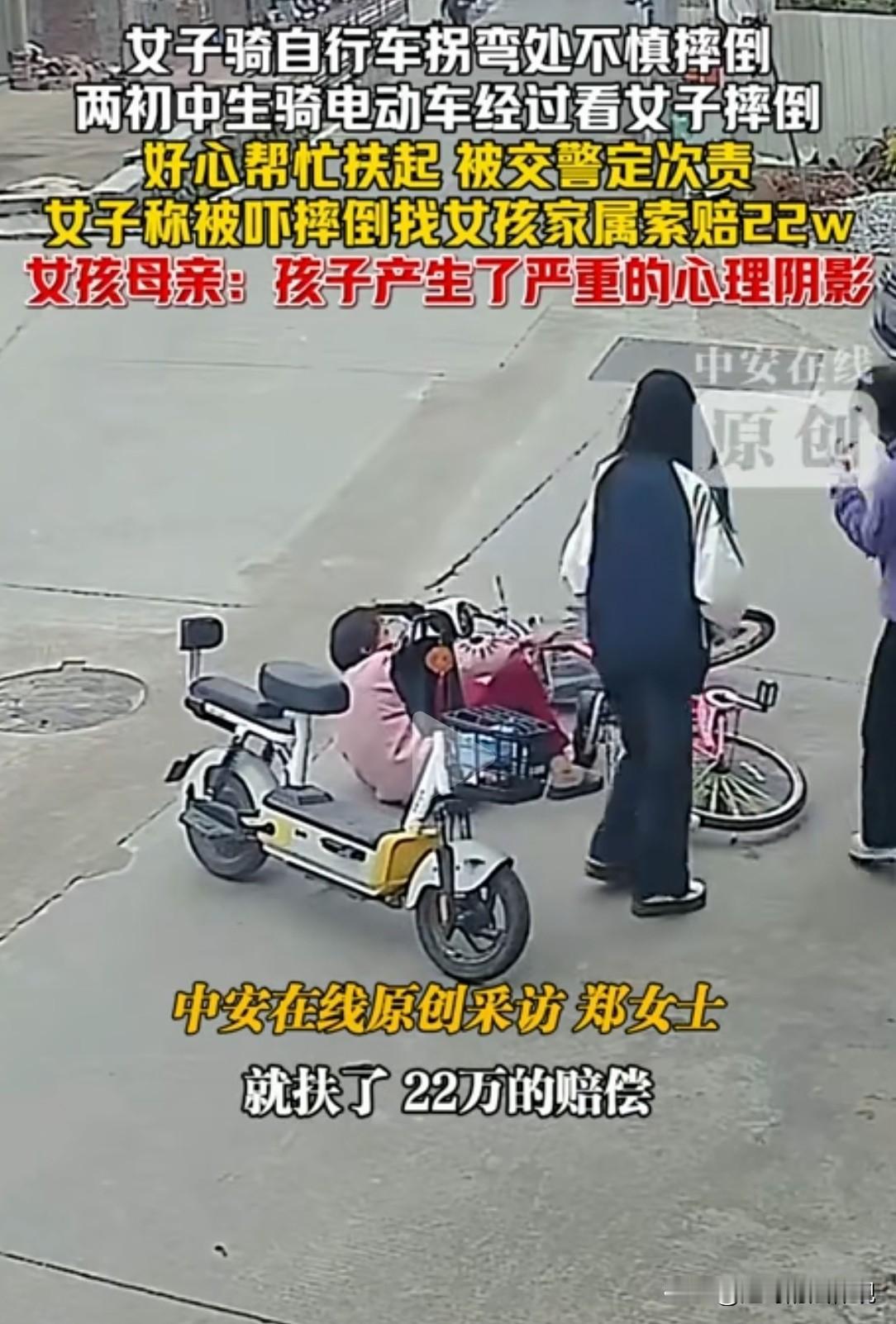 农夫与蛇的故事再次上演!福建,两个初中女生骑电动车外出时,发现一名女子骑自行车在拐弯处不慎摔倒,两人上前扶起女子。不料,女子报警,称被女孩电动车惊吓摔倒,两人被交警认定为“次责”。事后,女子将将女孩告上法庭,索赔22万多。因善意被辜负,女孩产生了严重心理阴影…… 林晓(化名)和陈悦(化名)是两名十五六岁的初中女生。 那天,她们骑着电动车外出,一辆白色的轿车驶过身边,两人并没在意。 而另一位女子,骑着自行车,在街道的拐弯处小心翼翼地前行。 当白色轿车拐弯后,出现在女子前方时,突然间,不知是啥原因,女子连人带车摔倒在地上。 因她的摔倒和白色轿车没关系,白色轿车没理这个茬,直接开走了。 她挣扎着想爬起来,可能因为摔伤了腿部,竟一时动弹不得。 在白色轿车驶过拐弯处后,林晓和陈悦骑着电动车也拐科过来。 她们发现了摔倒在地的女子,两人没多想就停下车,商量了一下,上前把摔倒的女子扶了起来。 这本该是一个温暖的故事开头,陌生人之间的善意相助。 然而,事情的发展出乎所有人的意料。 摔倒的女子报警,交警介入后,将这起事故认定为“无接触事故”。 并给两名帮忙扶人的初中女生定了“次责”。 也就是说,在事故责任认定里,她们需要为这起摔倒承担部分责任。 更让人心寒的还在后面…… 被扶起的女子认为,自己之所以摔倒,是因为两个女孩骑电动车突然出现,吓到了她。 这让家长们一头雾水,怎么,帮忙扶人还扶出责任来了? 原来,被扶起的女子,越想越觉得委屈,自己平白无故受了伤,总得有人负责。 于是,她向女孩们的家属提出了索赔,金额高达22万多元,精确到224307.73元。 这个消息对于林晓和陈悦的家庭来说,无异于晴天霹雳。 林晓的母亲李女士(化名)回忆起当时的情况,声音颤抖。 孩子只是出于好心去帮忙,怎么就成了被告呢? 从那以后,林晓和陈悦的生活发生了巨大的变化。 原本活泼开朗的两个女孩,变得沉默寡言。 林晓晚上经常做噩梦,在梦里,她总是被一群人指责,醒来后便躲在被子里偷偷哭泣。 陈悦也害怕出门,她觉得外面的人,都在用异样的眼光看她。 她们想不明白,老师从小就教导她们,学雷锋做好事,她照做了,可为什么会换来这样的结果? 她们是第一次鼓起勇气做好事,换来的不是感谢,为啥是一张冰冷的法院传票? 案件定于2月26日开庭。 女孩的母亲称,这件事给孩子造成了严重的心理阴影。 她们还小,她们想不明白,为什么好心帮忙,反而成了被告。 视频在网上发布后,迅速引发了热议。 大多数网友都站在两个女孩这边,认为这样的判决“寒了天下好人的心”。 有人感慨:“以后谁还敢扶老人、帮路人?” 也有人质疑这样的责任认定是否合理? 这起案件的关键,在于无接触事故的认定。 所谓无接触事故,指的是事故双方,没有发生物理接触,但一方的行为导致了另一方的损害。 在这起事件中,交警认为两个女孩骑电动车的行为,客观上对摔倒女子造成了“惊吓”,因此需要承担部分责任。 但这样的认定,在很多人看来过于严苛。 两个女孩只是正常骑行,看到有人摔倒后停车相助,整个过程没有任何违规行为。 如果连这样的善意举动,都要承担责任,那道德的成本未免太高了。 事实上,类似的事件并非第一次发生。 这些年来,“扶不扶”已经成了一个社会难题。 很多人不是不想帮,而是不敢帮,怕被讹,怕担责,怕惹上麻烦。 当一个人伸出援手时,他应该得到的是鼓励和保护,而不是惩罚和诉讼。 否则,下一次有人摔倒时,可能真的就没人敢扶了。 这起案件,将于2月26日开庭审理。 《道路交通安全法》第119条,该条对“交通事故”进行了定义。 规定“交通事故”是指车辆在道路上因过错或者意外造成的人身伤亡或者财产损失的事件。 只要车辆在道路上的行为,无论是因过错还是意外,导致了人身伤亡或财产损失,都属于交通事故范畴。 虽然两个女生骑电动车与摔倒女子,未发生直接接触。 但交警认为,女生骑电动车的行为,客观上对摔倒女子造成了“惊吓”,进而导致其摔倒受伤。 即女生的行为,与女子摔倒受伤这一损害结果之间存在因果关系,所以认定其需承担次要责任。 然而,从普通人的认知出发,女生正常骑行且无违规行为,很难直接认定为“过错”行为。 将其认定为导致女子摔倒的原因,可能会让普通人觉得过于严苛。 也容易让大家对做好事产生顾虑,担心因正常行为,被卷入不必要的纠纷中。 这也是引发社会广泛争议的原因所在。 毕竟,一个让好人寒心的社会,是所有人的损失。 当善意需要勇气,当帮助需要代价。 我们失去的,将不仅仅是几个愿意伸手的人,更是人与人之间最基本的信任和温暖。 两个十五六岁的女孩,用她们稚嫩的肩膀,扛起了一个沉重的社会命题。 她们的所作所为,值得每个人深思。 关注@赵哥的法律观
