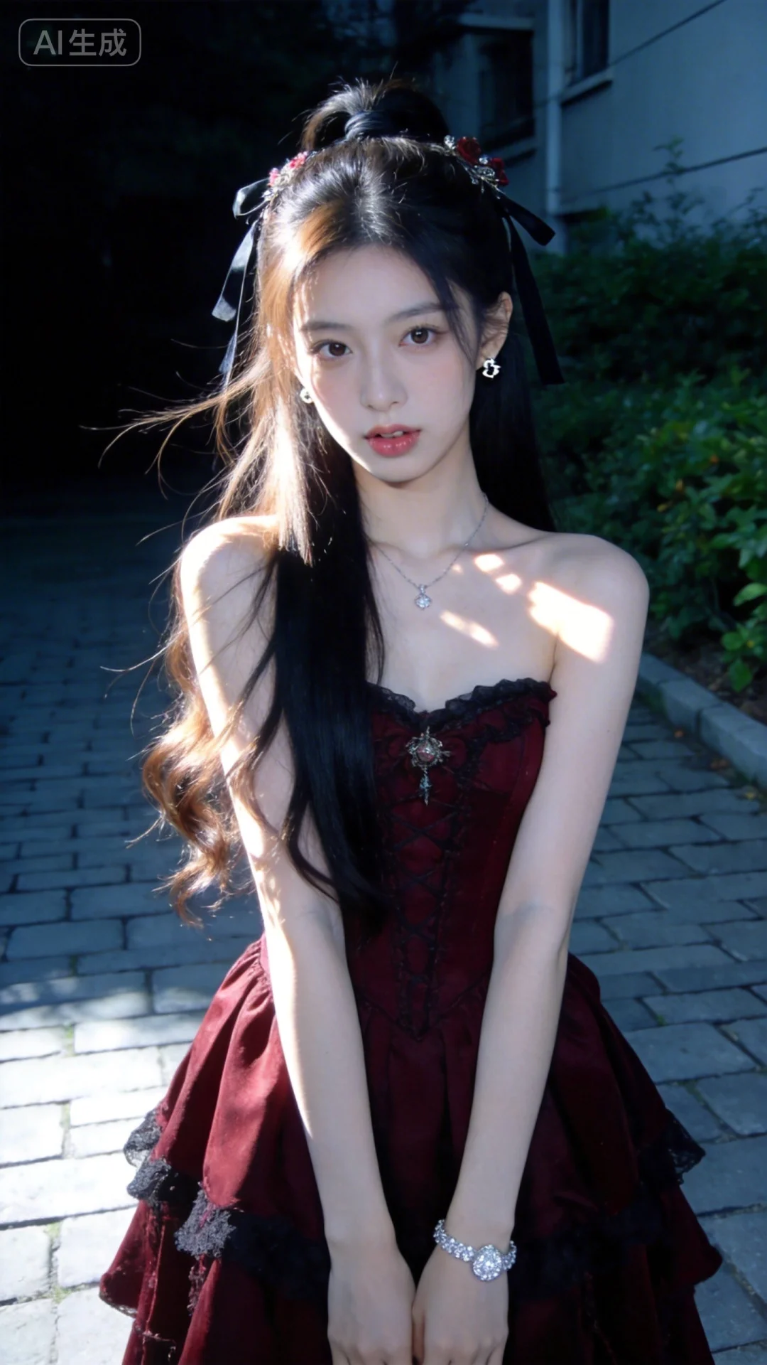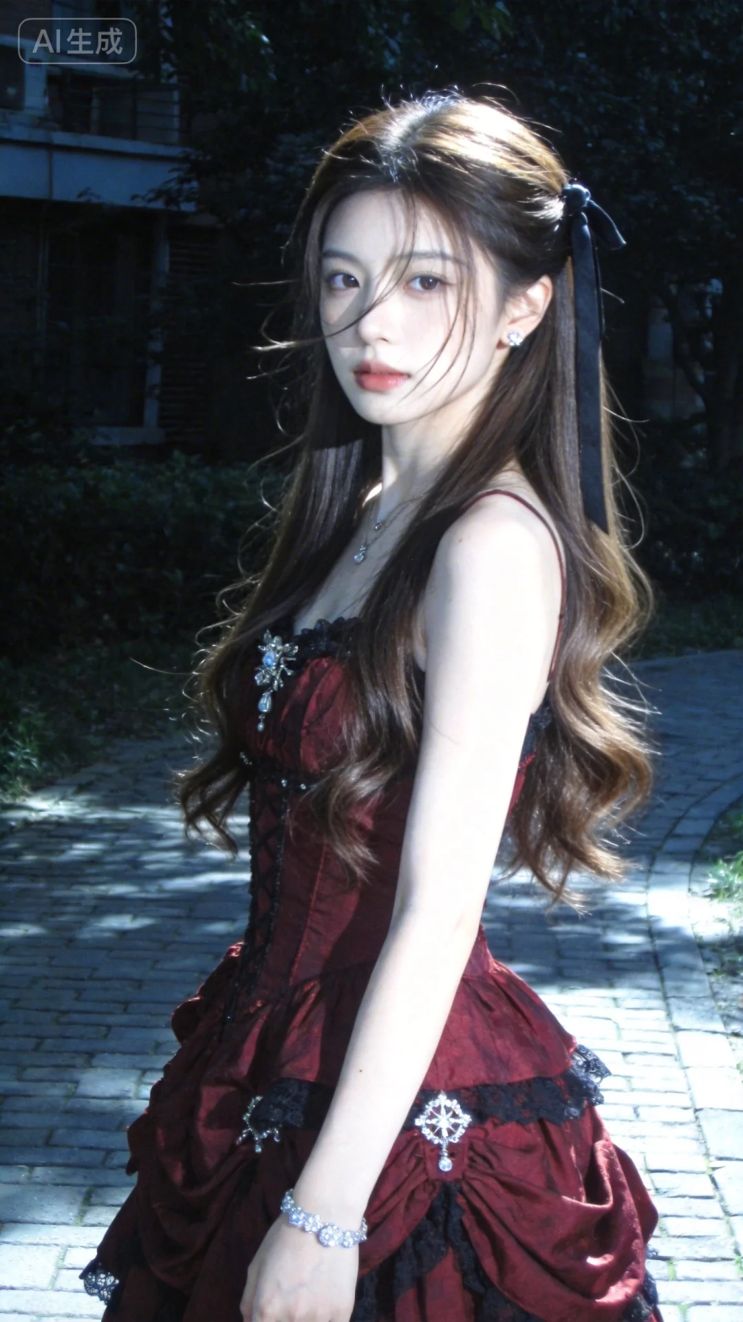 图片风格为写真,采用超写实的写真风格,整体冷色调,高曝光高亮度且对比强烈。画面中是一位拥有冰瓷玉肌冷白皮的绝世美人,皮肤细腻白皙、通透感强,瓜子脸,清纯气质。中景全身视角,完美身材露着胳膊。背景在小区绿植边的石砖路上,随机背景。她留着随机偏分的茶棕色直卷发,黑长直的头发用系带绑着,自然蓬松地垂在肩头,几缕发丝轻拂脸庞。身穿深红色哥特连衣裙,发饰和衣服精致感十足。戴着耳钉、项链和钻石手链。她做出可爱的表情,眼神情脉脉,专业模特的神情细腻自然,情绪氛围感拉满。阳光照在脸上形成明暗对比,发丝光和柔和侧光相伴,暗调背景使光影斑驳、层次丰富。轻微的曝光过度增添了空灵感、自然感等氛围,照片感染力和故事感强,32k超高清分辨率,无噪点。