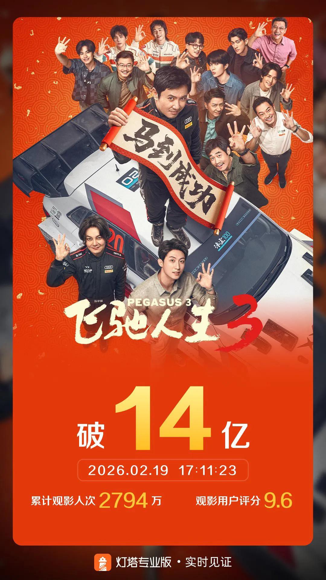 《飞驰人生3》票房破14亿,超越《速度与激情9》。 由韩寒执导,沈腾、尹正、黄景瑜、张本煜领衔主演,魏翔、沙溢、范丞丞、孙艺洲主演,段奕宏特邀主演,张新成、胡先煦、李治廷、白宇帆、周政杰、高华阳特别出演,贾冰、王安宇、陈永胜、冯绍峰、郝瀚友情出演的喜剧电影《飞驰人生3》累计综合票房破14亿,超越《头号玩家》、《速度与激情9》、《后来的我们》等片,进入内地影史票房总榜75强;超越《奇迹·笨小孩》,进入春节档历史23强。 《飞驰人生》自第二部开始就升级为特效大片,第三部的特效难度更是直线上升,但由于制作精良,很多观众甚至意识不到特效的存在。国产电影工业化程度之高,已经让好莱坞电影难以望其项背,也难怪在国内可以取得惊人的票房。飞驰人生