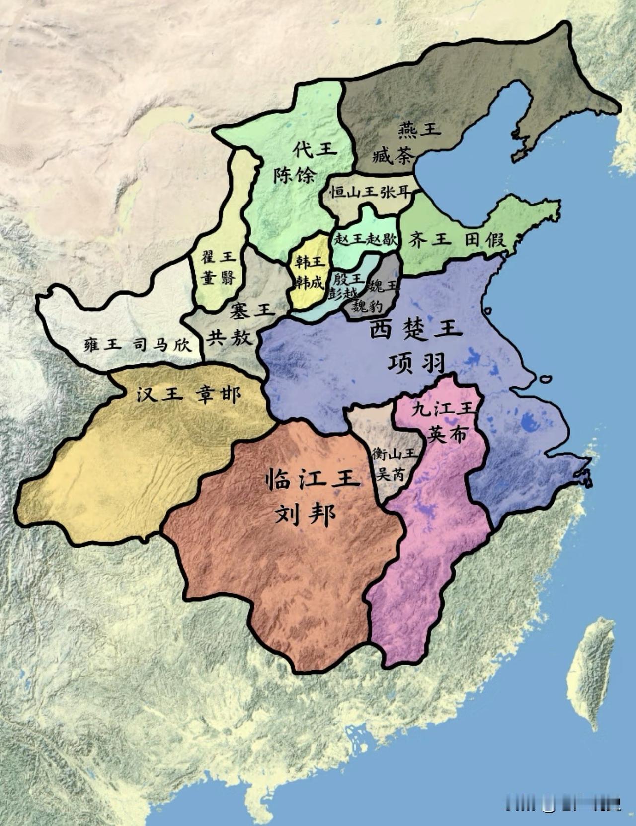 图一是西楚霸王分封的十八路诸侯王示意图 图二是网友调整分封的诸侯王分布图 如果刘邦不再是汉王,而是被封在更加偏僻穷弱的临江国,同时章邯、司马欣、共敖牢牢掌握着巴蜀、关中,那么,刘邦还有机会建立大汉王朝吗? 历史地图