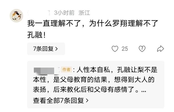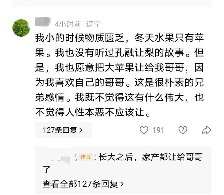 孔融怎么也没想到, 多少年以后, 因为罗翔的话, 一件小小的让梨的事儿, 成了巨大的争议话题。 到底是人之初性本善呢, 还是人性本自私? 或者是一些不怀好意的货色, 夹带私货?