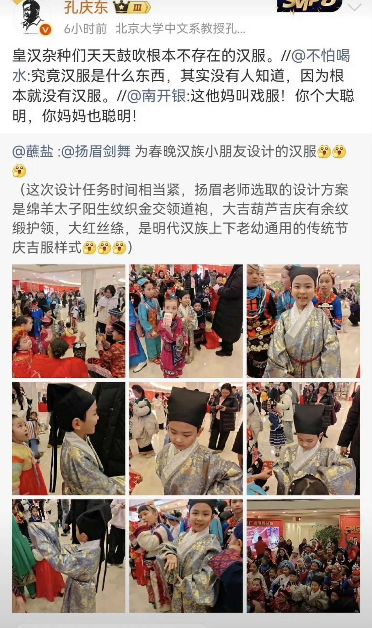 哎我去!这什么情况?北大的孔庆东教授挺爱网上冲浪啊,之前对年夜饭下手,说要立法取消年夜饭,这会又看汉服不顺眼了!穿个汉服就是皇汉了?!穿个衣服你都能破防?! 你算干嘛地啊,一个教授,学术上一点成果建树没有,成天就在网上扯蛋玩儿! 一天天斜眼吊炮的就知道煽动对立!指定是有点啥说法![抠鼻][抠鼻][抠鼻][抠鼻]
