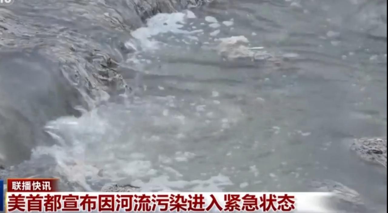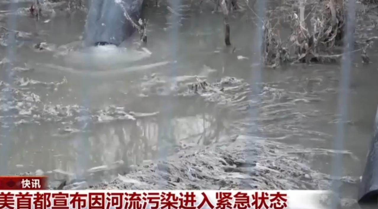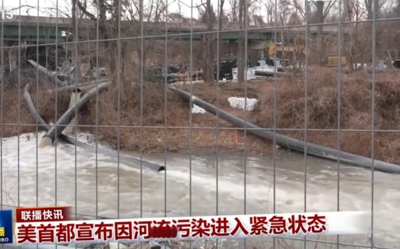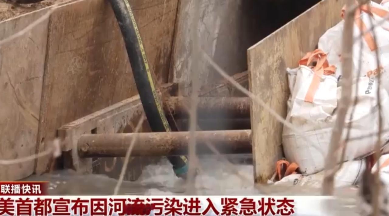 美国首都因河流污染进入紧急状态,现场可见多根管道向浑浊的河水中排放污水,水面泛起大量泡沫与污物,岸边植被枯萎、垃圾遍布。应急设备正进行抽水作业,沙袋与临时围堰试图控制污染扩散,这一事件凸显了当地环境治理的严峻挑战。