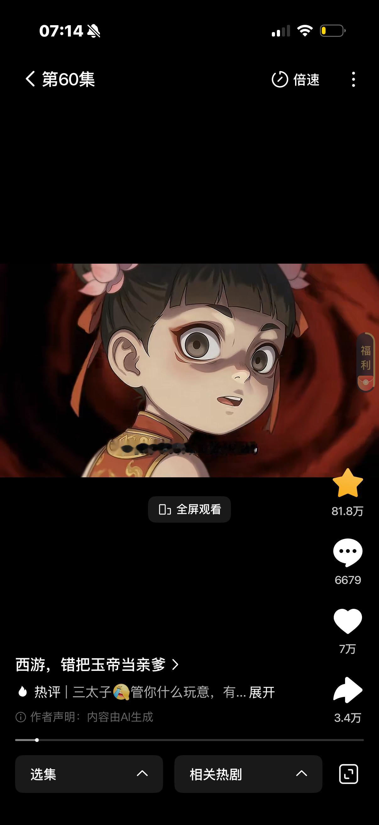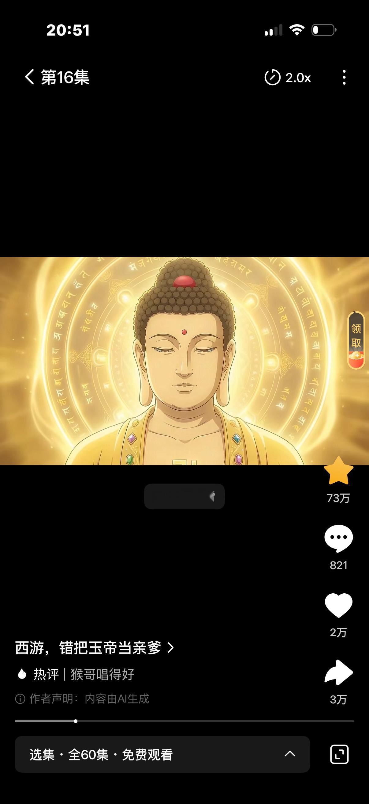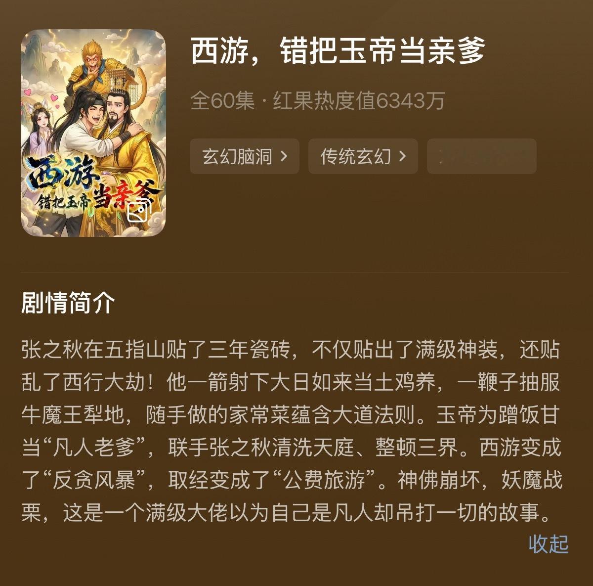现在ai漫剧 都上6300了 比很多头部强了!而且这部成本才10万 西游,错把玉帝当亲爹 告诉我们围绕西游记这个ip可开发的东西真的太多了!如果有钱再做精致点, 不得了! 不过这部确实还不错,牛魔王和妖族太子xswl!还有天庭三大反骨仔也很可爱!