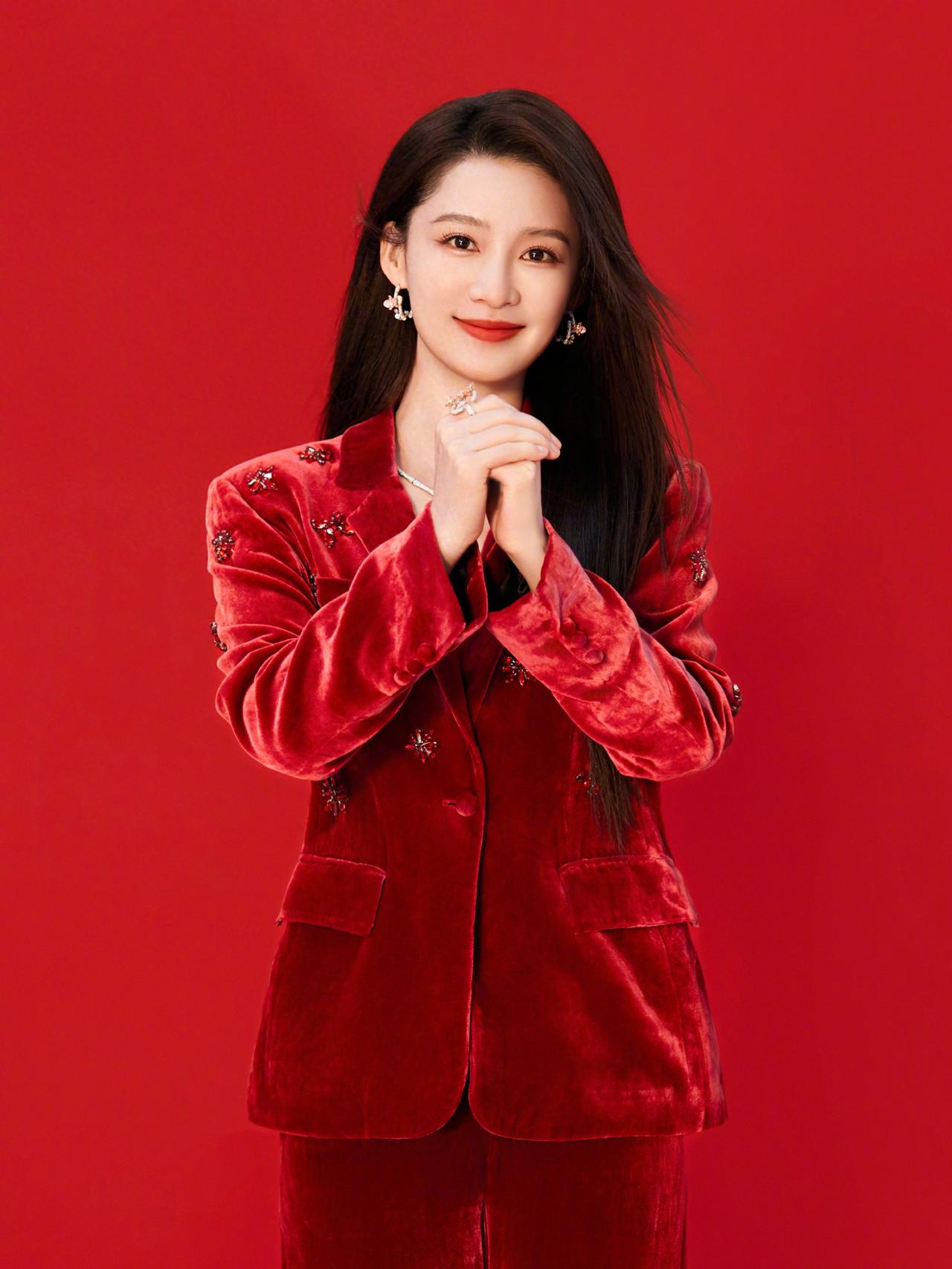 舒畅, 红彤彤的背景, 红彤彤的长裙, 这喜庆劲, 祝她和我们大家马年吉祥,万事
