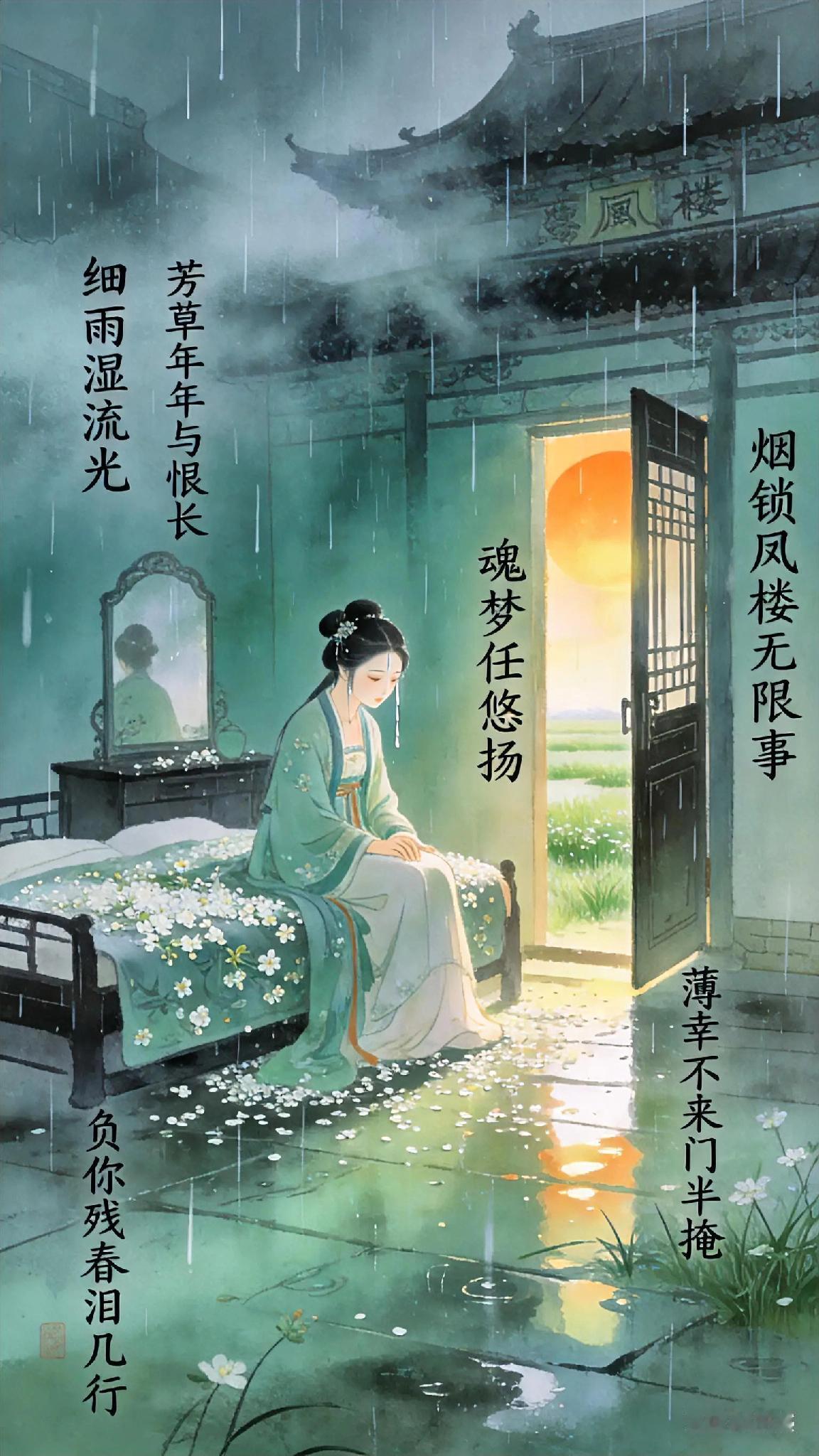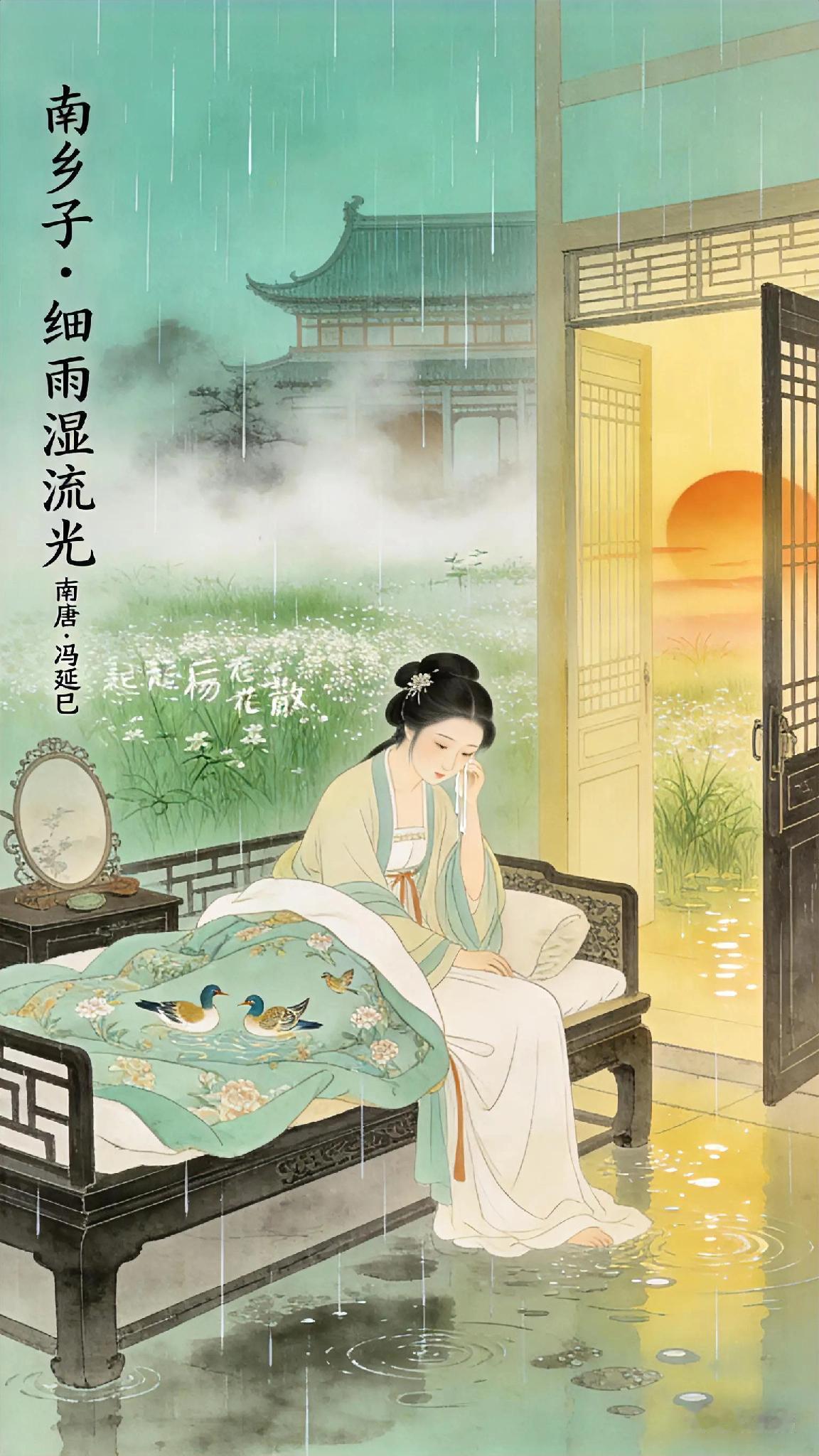 《南乡子》南唐、冯延巳。 细雨湿流光, 芳草年年与恨长。 烟锁凤楼无限事, 茫茫。 鸾镜鸳衾两断肠。 魂梦任悠扬, 睡起杨花满绣床。 薄幸不来门半掩, 斜阳。 负你残春泪几行。 《南乡子》现代译文: 微雨浸润着草叶的浮光,芳草与离愁年年滋长。 烟霭笼罩凤楼,往事如雾茫茫,镜中孤影、被上鸳鸯,皆令人断肠。 梦魂自在飘荡,醒时杨花落满空床。 虚掩房门盼薄情郎,却只见斜阳,辜负了这暮春,空余泪千行。
