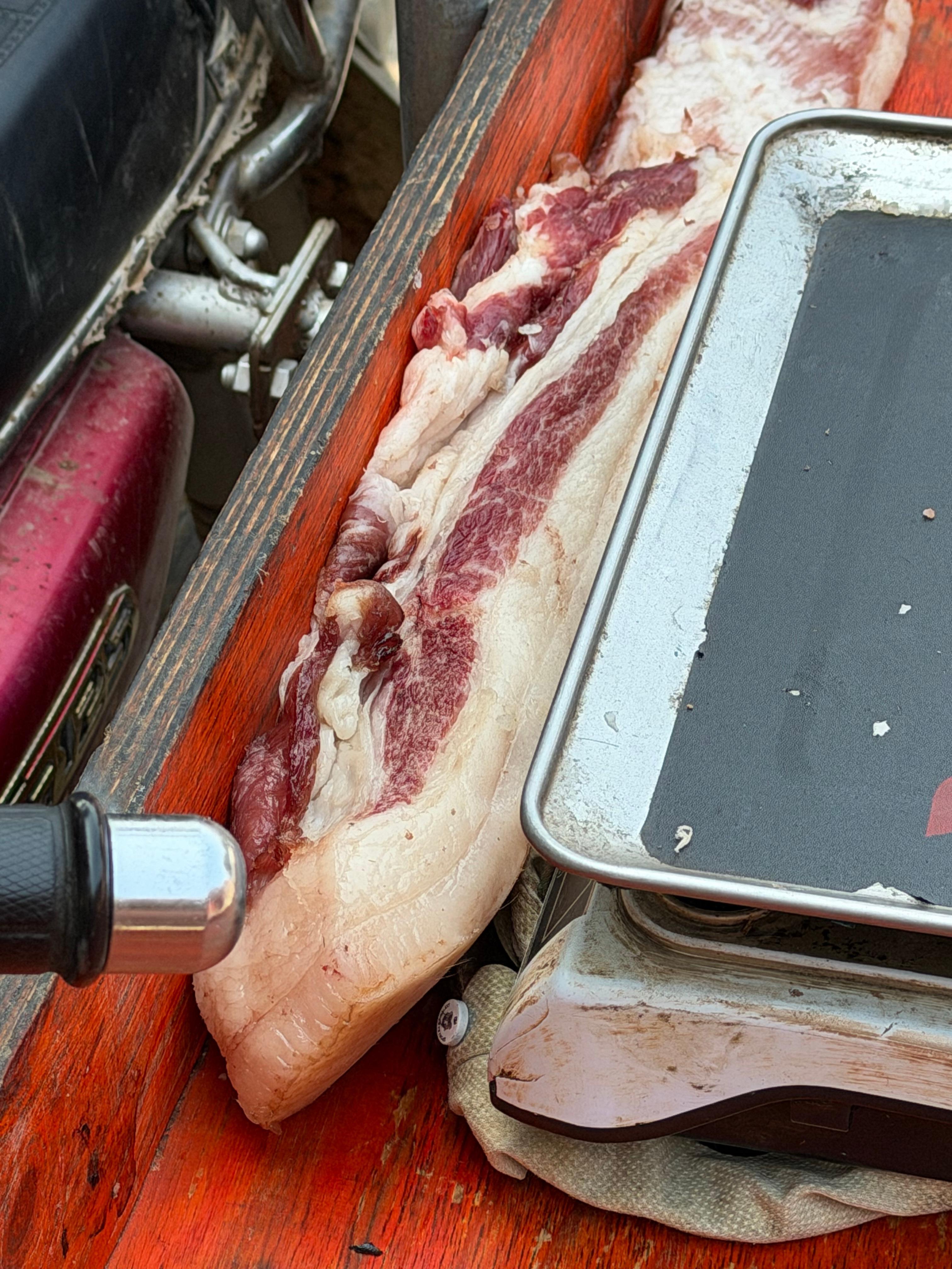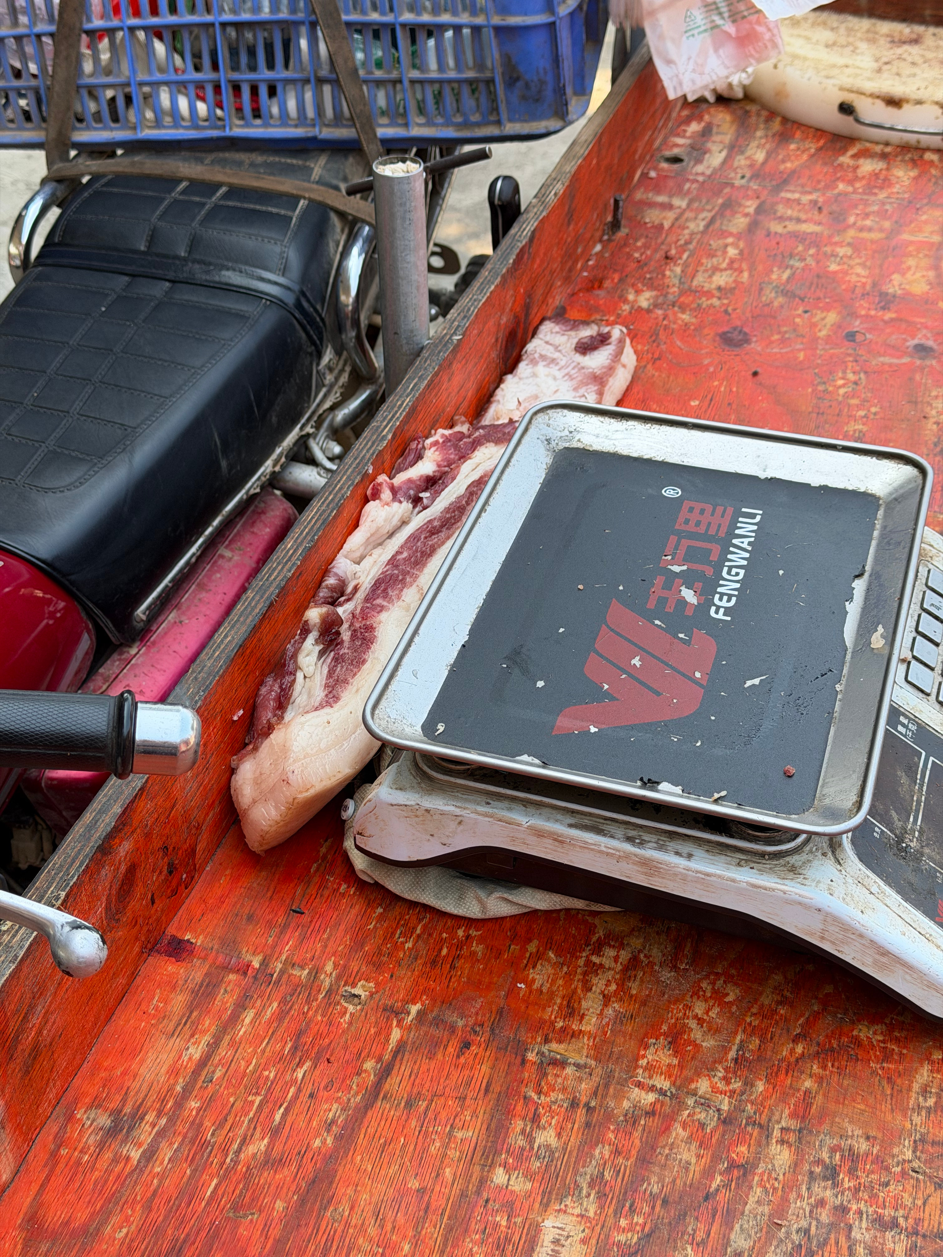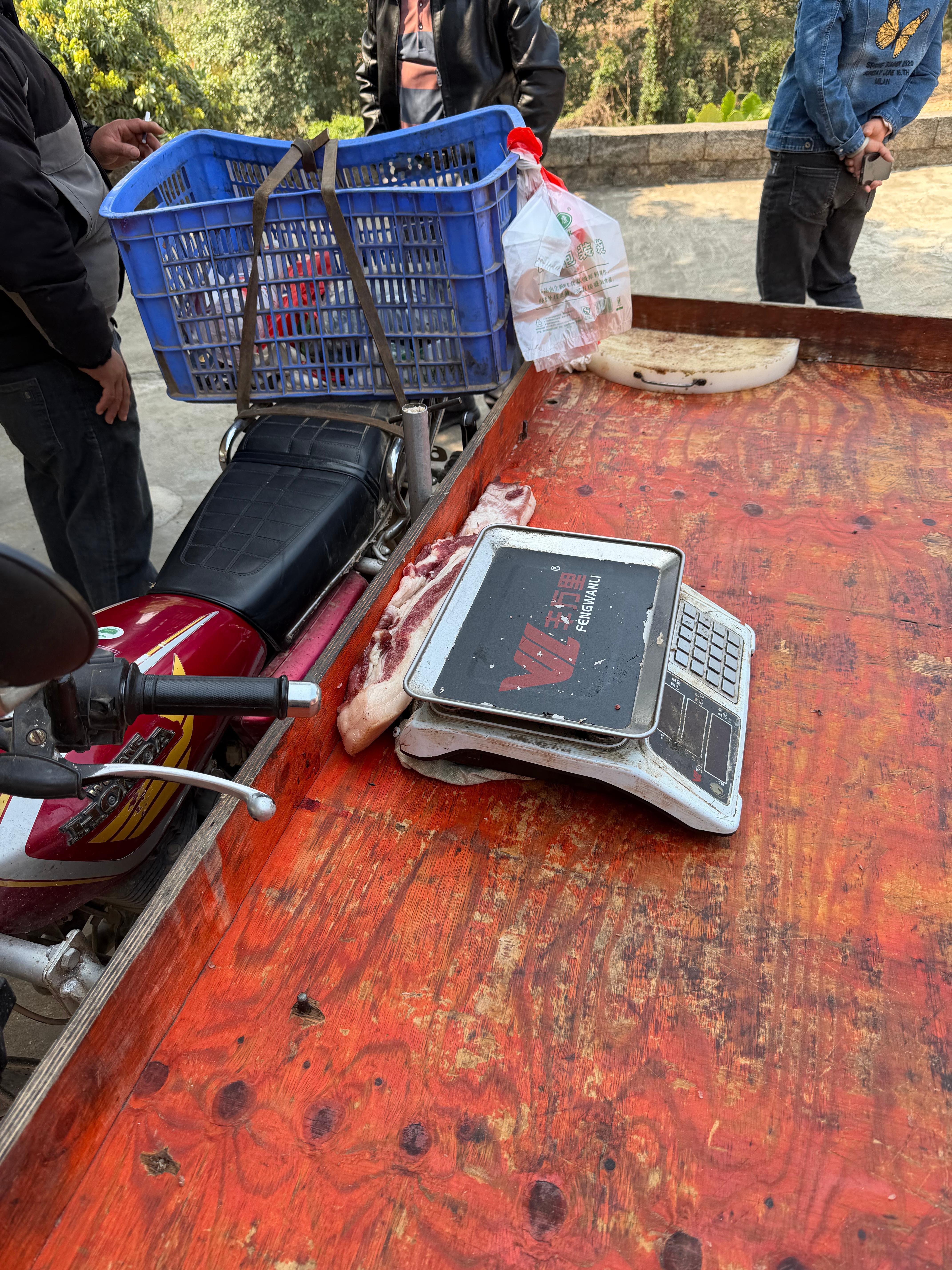 中午刚到家,看到我妈在买猪肉,人给直接送到我们家院子卖,就村里那种走街串巷来销售