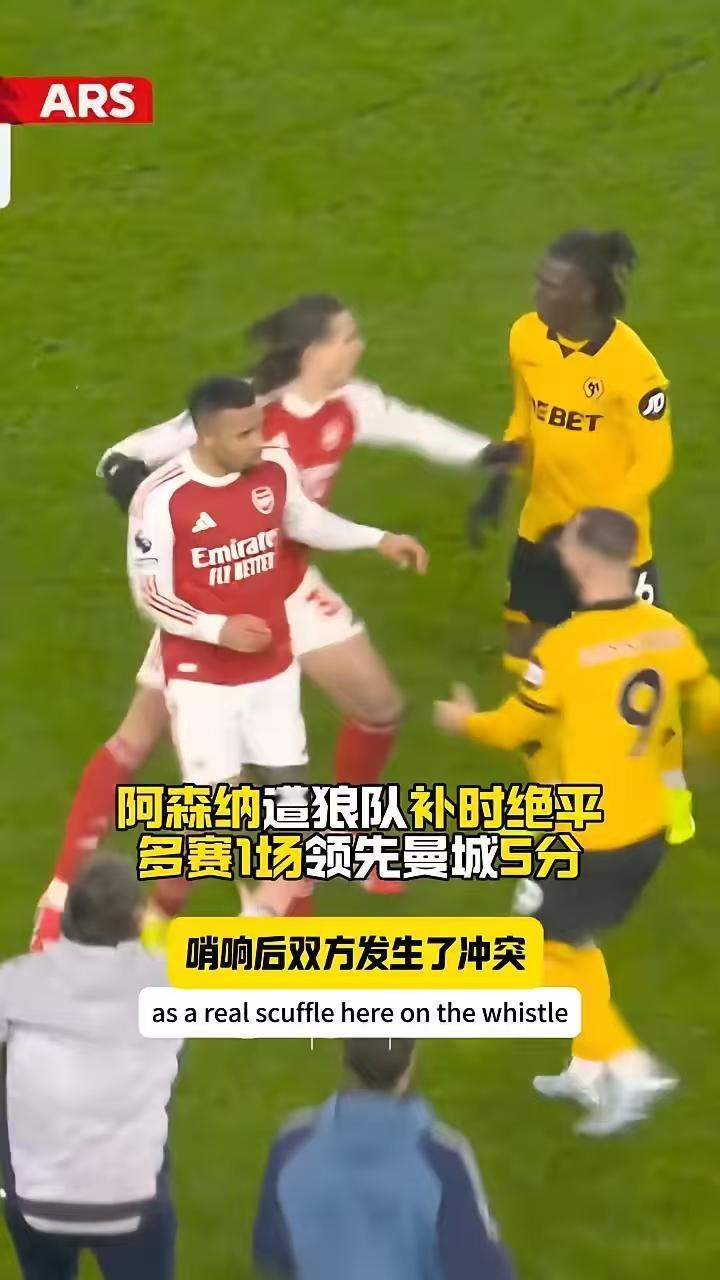 狼队是一支给其他球队制造过麻烦的球队。 赛前阿森纳主帅阿尔特塔的回应,成为斩钉截铁的现实。 据统计,赛前排名积分榜垫底的狼队,在2球落后的情况下,面对榜首球队阿森纳最终战平,这是英超历史首次出现。 这不应该是历史,简直就是耻辱。 即便本赛季铁定降级的狼队,依然野性十足。 2026年或许是狼队的幸运年。 自打去年12月31日战平曼联之后,否极泰来,大有“咸鱼翻身”之势,近9轮1胜5平3负拿了8分,只输3场比赛,包括战平曼联、纽卡、阿森纳这样的名场面。而此前的18轮比赛一共只拿了2分,2平16负,还包括12连败。 感谢曼联前主帅阿莫斯的“八辈祖宗”。 27轮比赛只拿到十个积分的狼队,让众多球迷看到了什么才是“置于死地而后生”,什么是真正的“荣誉之战”。 第5分钟,阿森纳左路策动进攻,马丁内利回传,赖斯得球斜传禁区,萨卡头球攻门得手。 第56分钟,加布里埃尔送出直塞,因卡皮耶左侧肋部得球突入禁区,一脚爆射打进,VAR介入确认进球有效。 60分钟后,比赛进入到“狼队时间”。 第61分钟,角球之后的二次进攻机会,狼队乌戈·布埃诺肋部调整后起脚攻门,轰出一记世界波。 第94分钟,替换上场十分钟的埃多齐,禁区内起脚打门,替换上场只有一分钟的阿森纳33号卡拉菲奥里,封堵后球击中立柱弹进球门。 乌龙球,葬送了阿森纳38分钟的领先。 好运,终于眷顾了此前“谁见了谁揍”的狼队。 荣誉战,是为了捍卫荣誉,必须勇敢的去战斗,而不是为了荣誉,去“例行公事”的应付。 更不是所谓的“揭幕战、生死战、荣誉战、火车站”“, 如果你还要脸的话。 阿尔特塔的领头羊,到头来终究还是”羊性十足“。即便众多”羊友“竭尽所能的“衬托”,阿森纳还是在不时“点踩刹车”,将前两名之间的分差,主动从7分,一路缩小到了5分。 本轮更是让排名垫底的狼队,反咬了两口,差点“嘎了”。并且还是在各种数据近乎都是两倍的情况下。 第94分钟,狼队左路直接劲射打门,门将拉亚扑球时,竟然与中卫加布里埃尔相撞到一起,给了埃多齐打入绝平球的绝佳机会。 说实话,面对狼队连绵不断的绝地反击,阿森纳后防线已经乱了节奏。 而倒地不起的热苏斯,听到终场哨响后,竟然跳起来和对手爆发肢体冲突,引发双方球员之间的争执、冲突。 这一幕,直观地说明,阿森纳球员在客场的情绪已经彻底失控,恼羞成怒了,输不起了。 这可不应该是志在夺冠球队应有的表现。 赛后阿尔特塔表示,阿森纳这场比赛没有展现出英超榜首的统治力与控制力,甚至有些基础的细节方面也没有做好,被对手抓住了机会。我们感到沮丧,因为责任在我们自己。 而在赛前阿尔特塔的展望是,我们想一骑绝尘夺冠。 想一想此前第26轮1:1布伦特福德,为阿森纳扼腕叹息的同时,由衷的感到, 阿尔塔特还是太稳重了,太刻板了。始终缺少了克洛普的破釜沉舟的豪气。 而正是这样的铁血玩命,才赢得了师傅瓜迪奥拉的尊重,称赞其是唯一的最难对付的对手。 阿森纳名宿阿兰-史密斯表示,阿森纳与狼队这场令人震惊的平局,不仅可能成为争冠路上的关键节点,更可能是英超冠军争夺的转折点。现在争冠主动权已经到了曼城手里。 而曼城瓜帅近日则很担忧,接下来在英超输一场可能就争冠出局。 这可谓英雄所见略同。 最近很拉风的卡拉格的愿望,或许更具理想化,我更希望阿森纳夺冠,因为我认为联赛有不同的冠军是好事。而在本赛季之前,过去八届英超冠军均由曼城或利物浦包揽。 温格时代阿森纳,被球迷讥讽称为“千年老四”。阿尔塔特入主五年来,球队成绩升级为“千年老二”了,但英超冠军依然是”可望不可即“,涛声依旧。 英超冠军里,有的昙花一现,降级去了遥远的英冠联赛,比如一冠莱特斯特城, 有的在重建之路上蹉跎岁月、几度沉浮,比如十三冠曼联, 有的则是满血复活,虎视眈眈,比如四连冠曼城, 英超群雄里,要杀出一条血路夺得冠军,不止是需要天时地利人和, 还需要底蕴, 需要智慧。 本赛季的阿森纳,接下来要给球迷展示的, 是漫天的”腥风血雨“,震慑敌胆的杀气, 还是“千年老二”的底蕴呢?