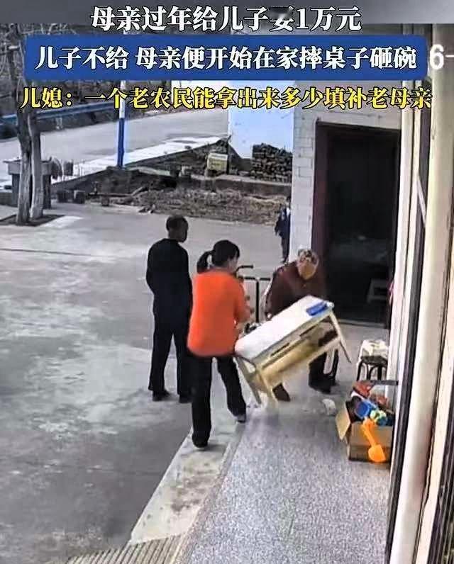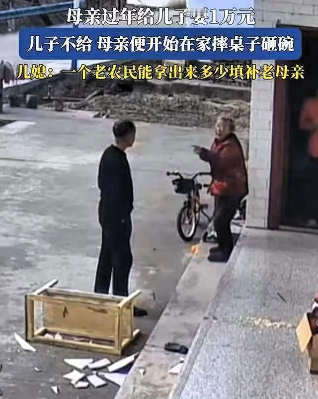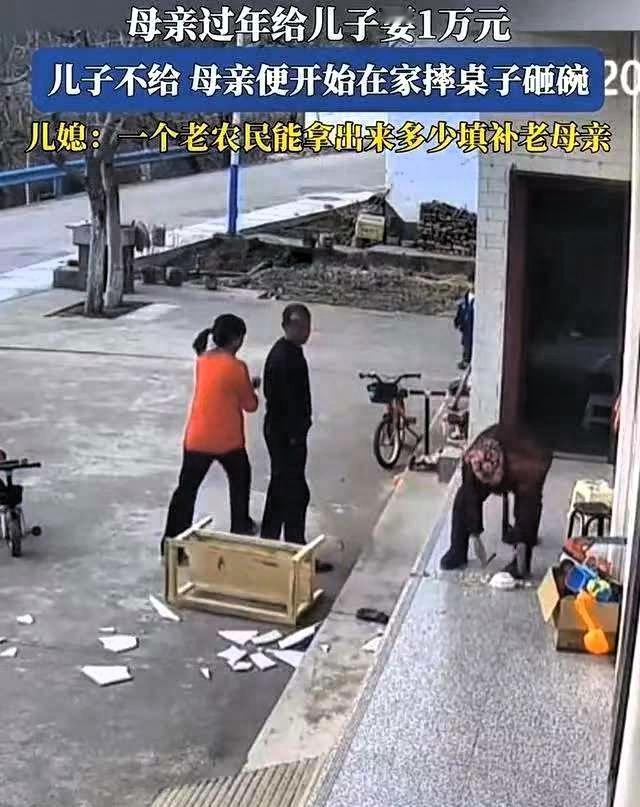 看的心酸!陕西,儿子儿媳过年回老家看望母亲,吃完饭老母亲突然朝儿子要10000块钱 儿子表示暂时拿不出来,老人情绪激动,摔碎了桌上的餐具,儿媳在一旁十分无奈。这件小事,照见了很多普通家庭的现实困境。 很多人第一眼会觉得老人过于冲动,但仔细想想,这背后更多是长期缺乏安全感的自然反应。农村老人没有稳定的养老金,日常开销、生病就医都要依靠子女,年纪越大,心里越不踏实。他们并非刻意索要钱财,更多是想用这种方式,给自己多留一点保障,少一点后顾之忧。 另一边,儿子在外打工,要承担家庭日常开支、房租和孩子的费用,经济压力本就不小。不是不愿赡养,而是能力有限。按照相关规定,赡养费应结合子女的实际负担能力,强行施压并不能解决根本问题。 这件事没有绝对的对错,只是普通人在生活压力下的无奈碰撞。老人要的是安心,子女难的是生计,两者交织在一起,才出现了这样令人心疼的场面。 比起一时的情绪争执,更重要的是彼此理解。老人多体谅子女在外打拼的不易,子女也多关注老人的生活和心理需求,多沟通、多陪伴,才能减少不必要的矛盾。 家庭和睦,从来不是靠钱堆出来的,而是互相体谅、互相支撑。这样的场景,其实也在提醒我们,关注农村老人的养老保障,多给他们一些实实在在的依靠,比什么都重要。
