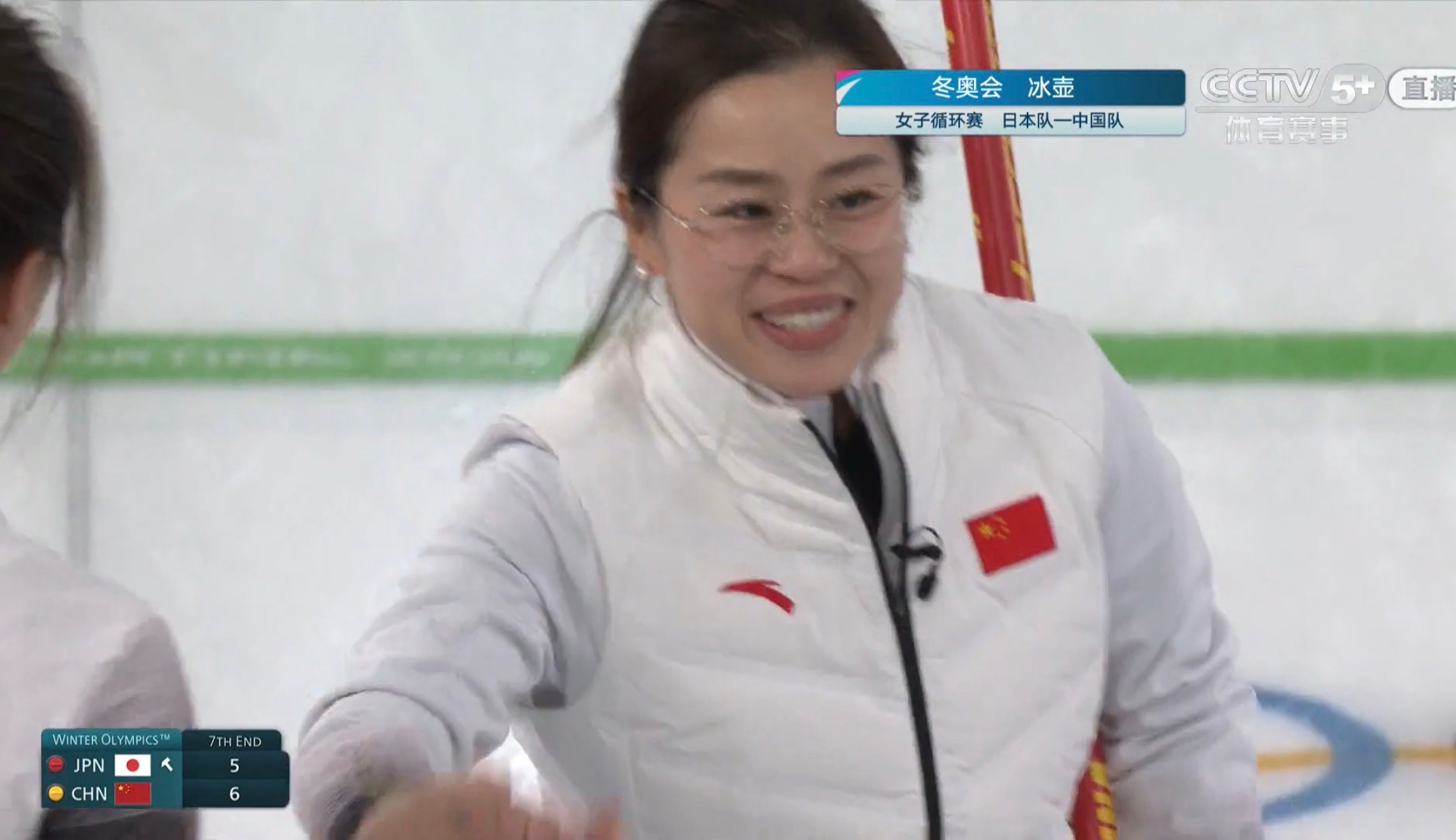 燕姿女士真的很给面子,老妹儿都打笑了 我们后手2分6-5反超。米兰冬奥会冰壶女子