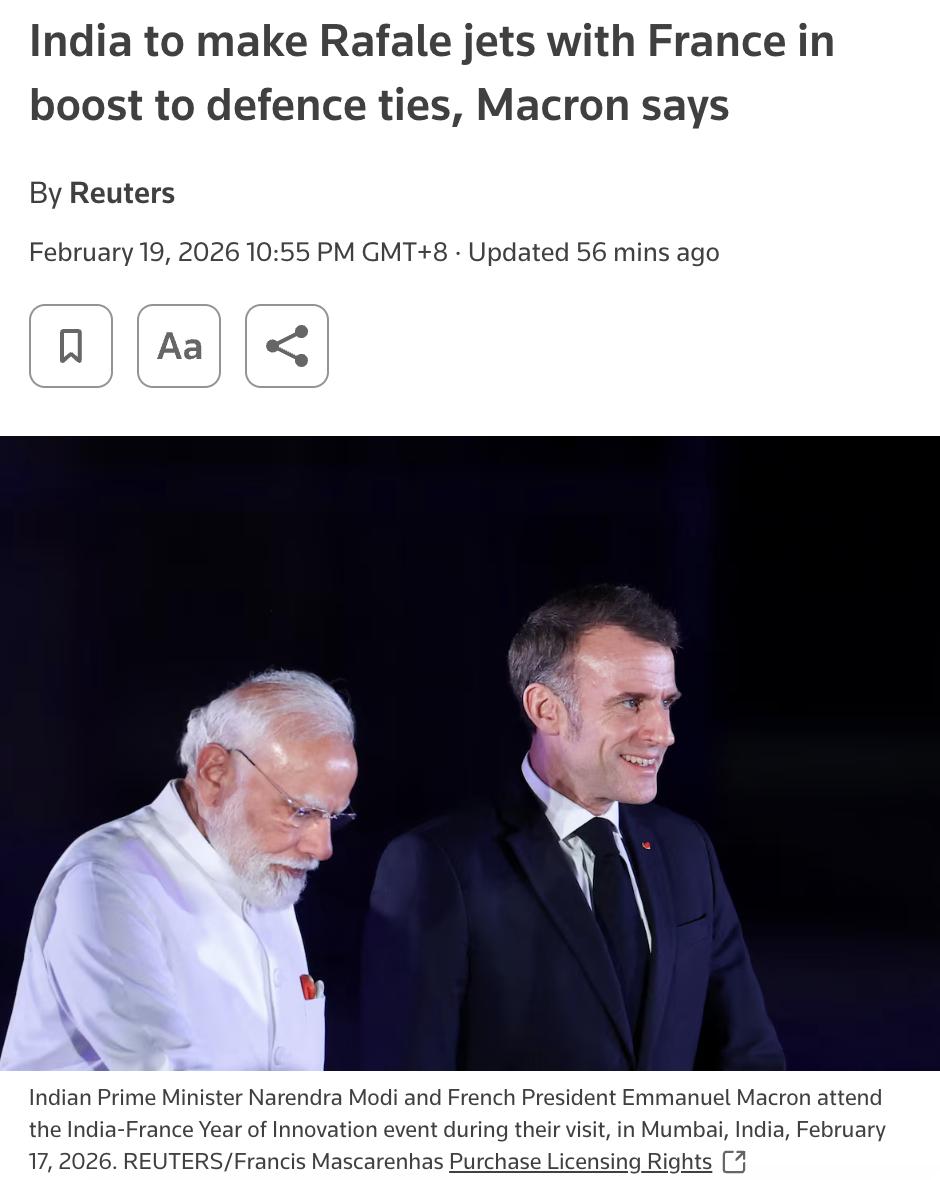 外媒:法国总统马克龙表示,法国和印度将进入国防合作新时代,计划联合生产“阵风”战斗机和直升机,印度国防采购委员会已批准再购买114架“阵风”战机,预计交易金额约356.5亿美元,其中最多90架可能在印度生产。 此外,法国还希望向印度出售更多潜艇。目前印度已购买36架“阵风”战机,还订购了26架海军版。双方还计划在印度联合生产H125直升机和“锤”式导弹。