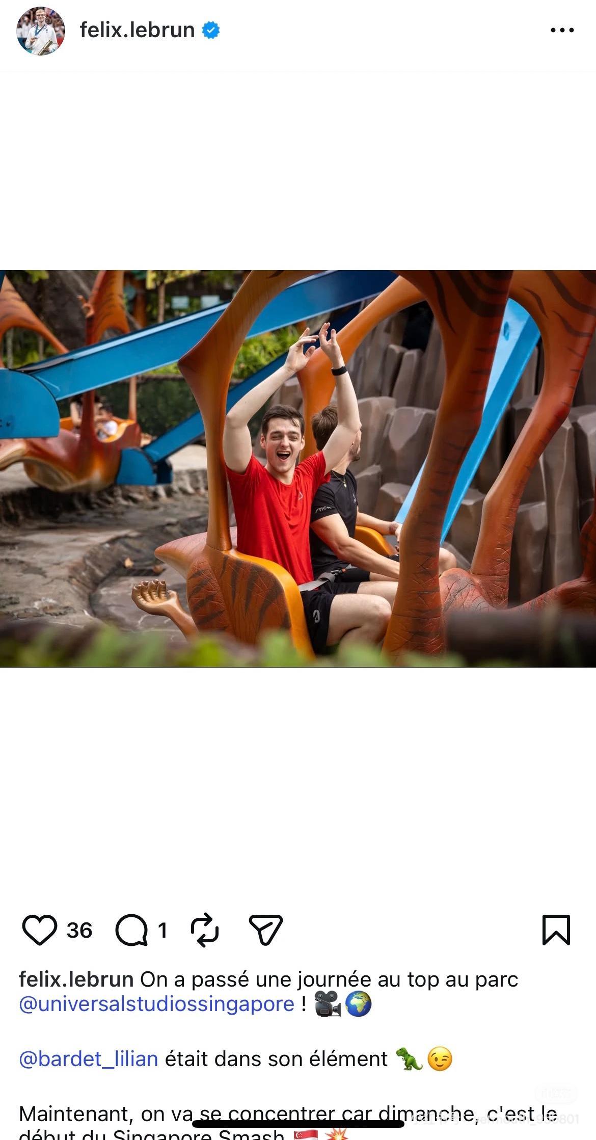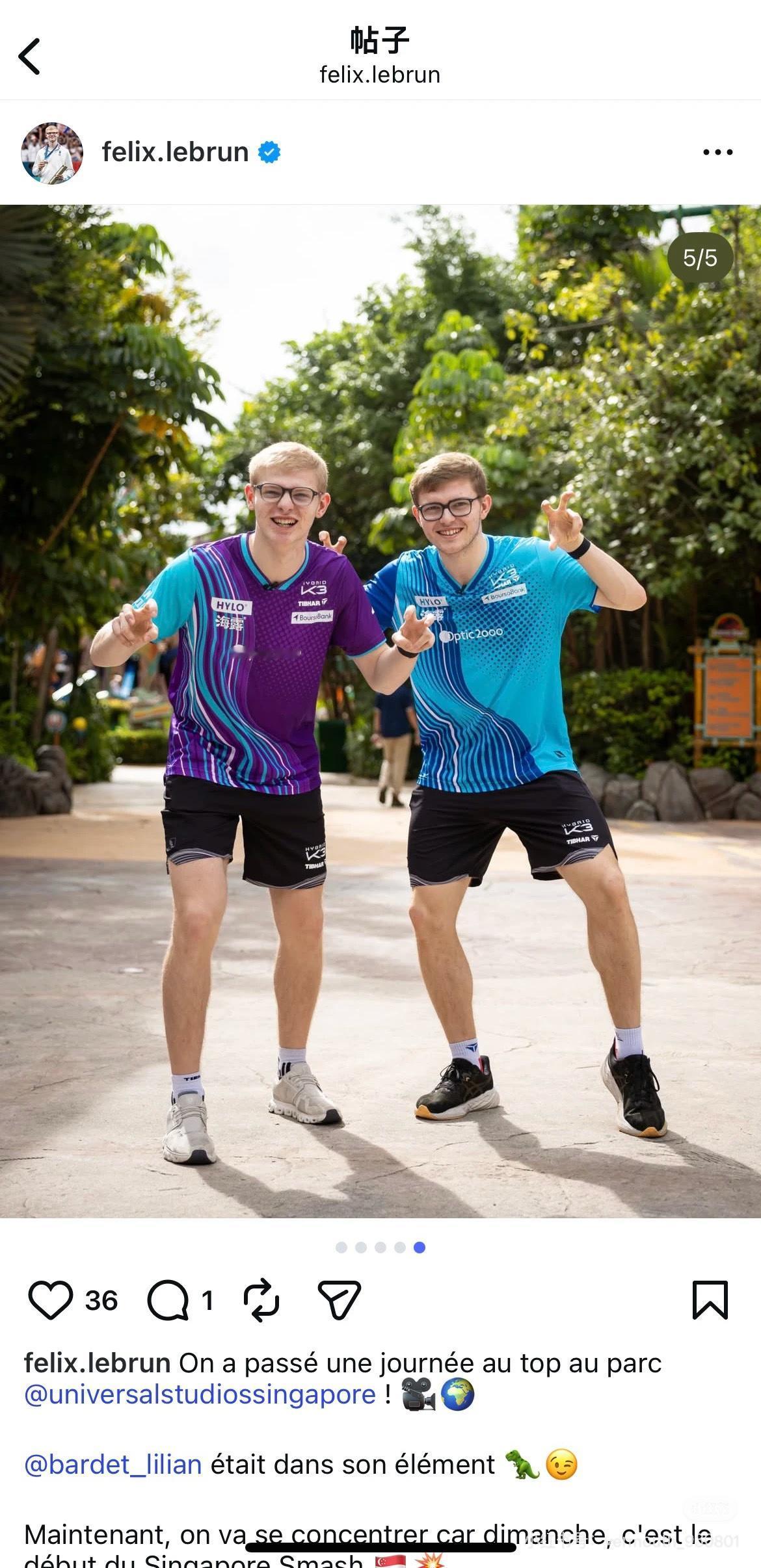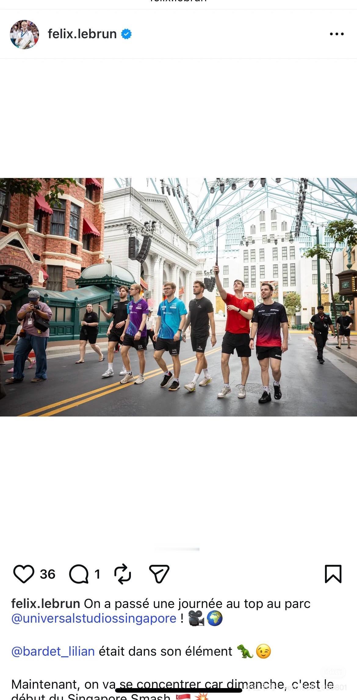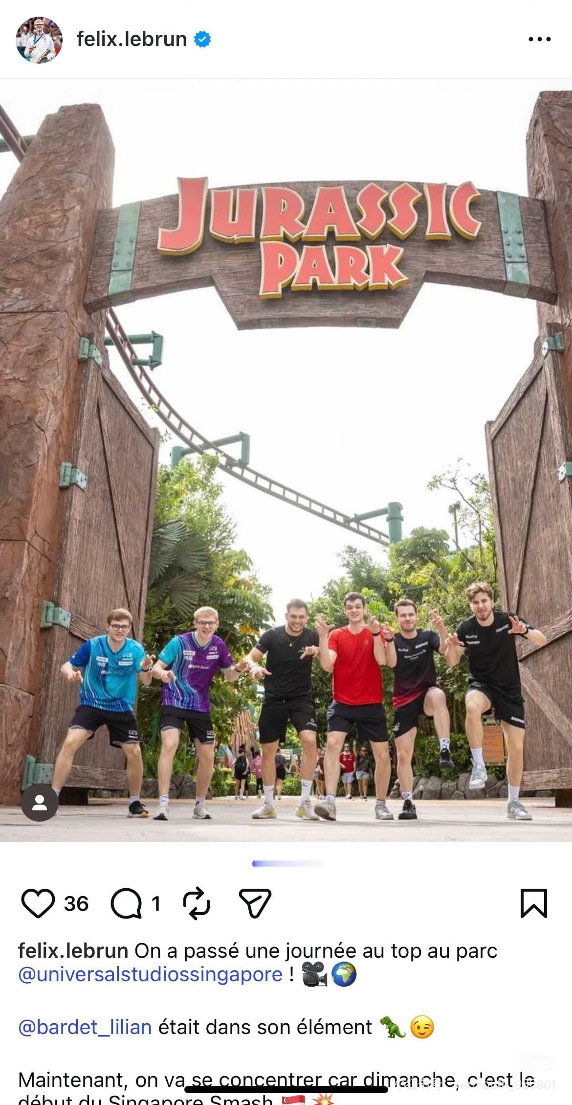 小勒布伦更新:我们在新加坡环球影城度过美好的一天! 2月19日,小勒布伦更新: 我们在新加坡环球影城度过 美好的一天! 巴德完全如鱼得水, 现在我们要集中精力了, 因为周日, 新加坡大满贯就要开赛! 勒布伦兄弟提前几天到达新加坡, 在新加坡体验环球影城, 勒布伦兄弟一直比较放松, 松弛有度, 这是欧洲人的特点, 打球也很随意, 手感比较强, 对国乒男队来说, 勒布伦兄弟的冲击力和 威胁性很大, 新加坡大满贯资格赛已经打响, 国乒加油!