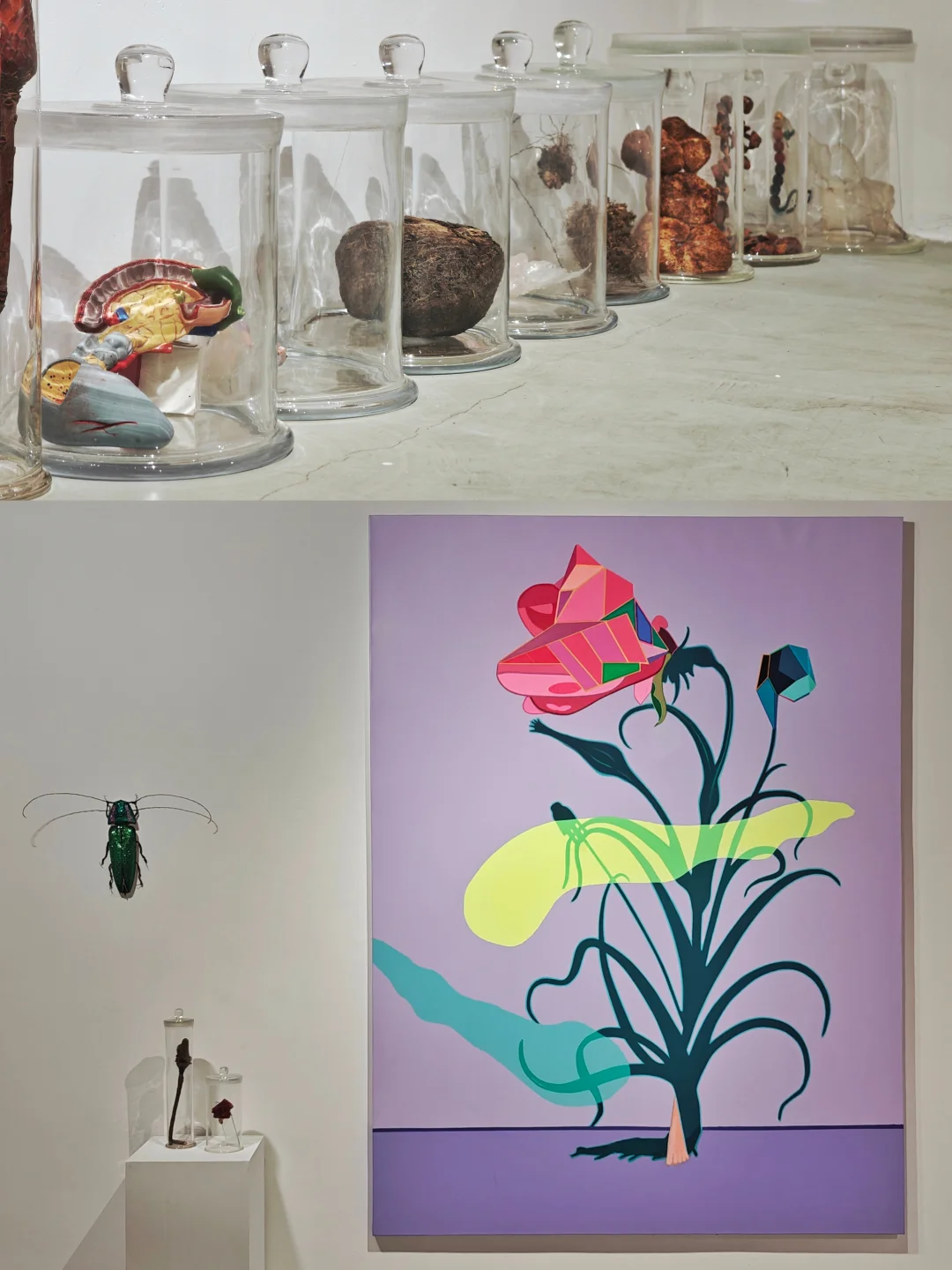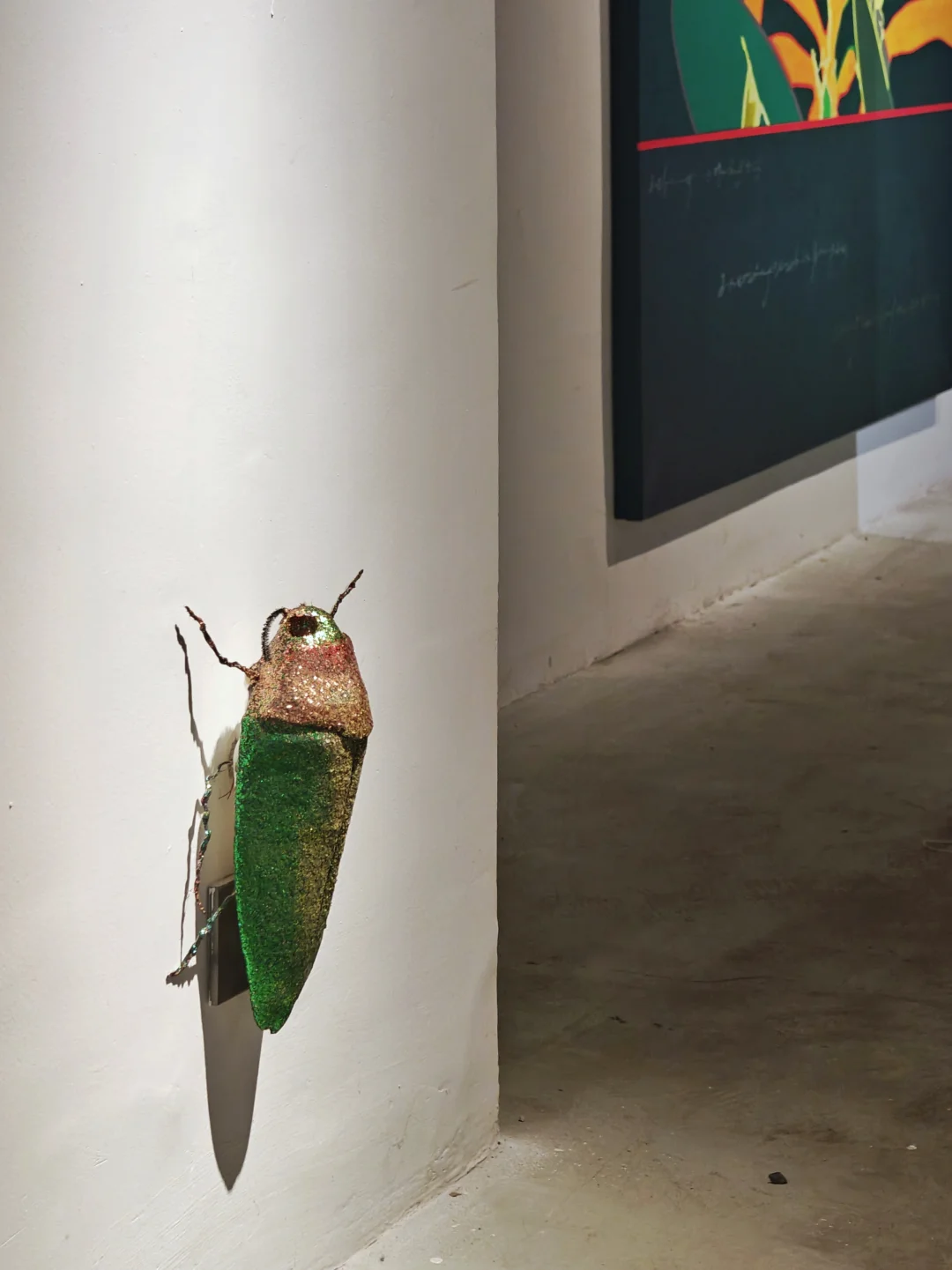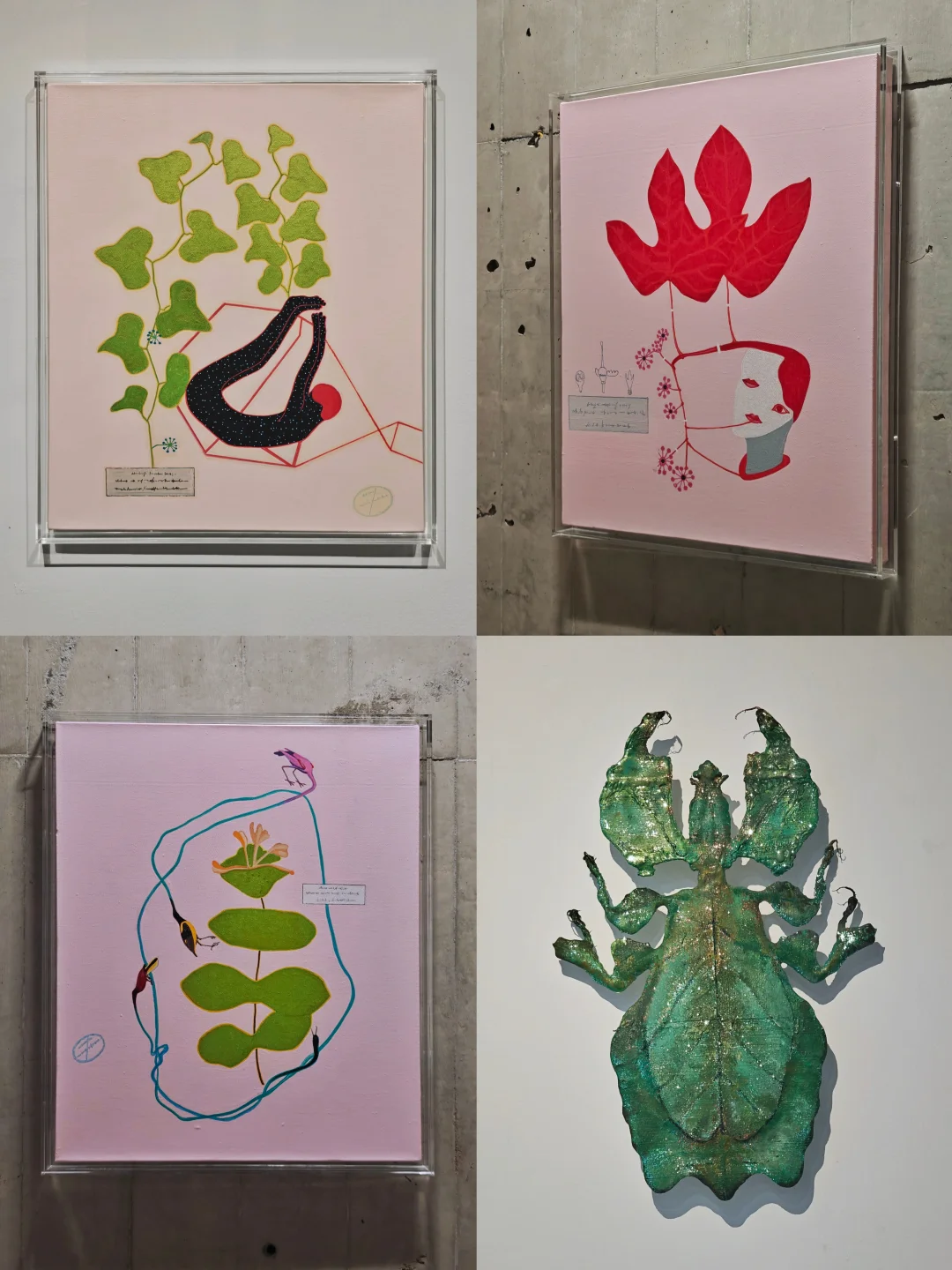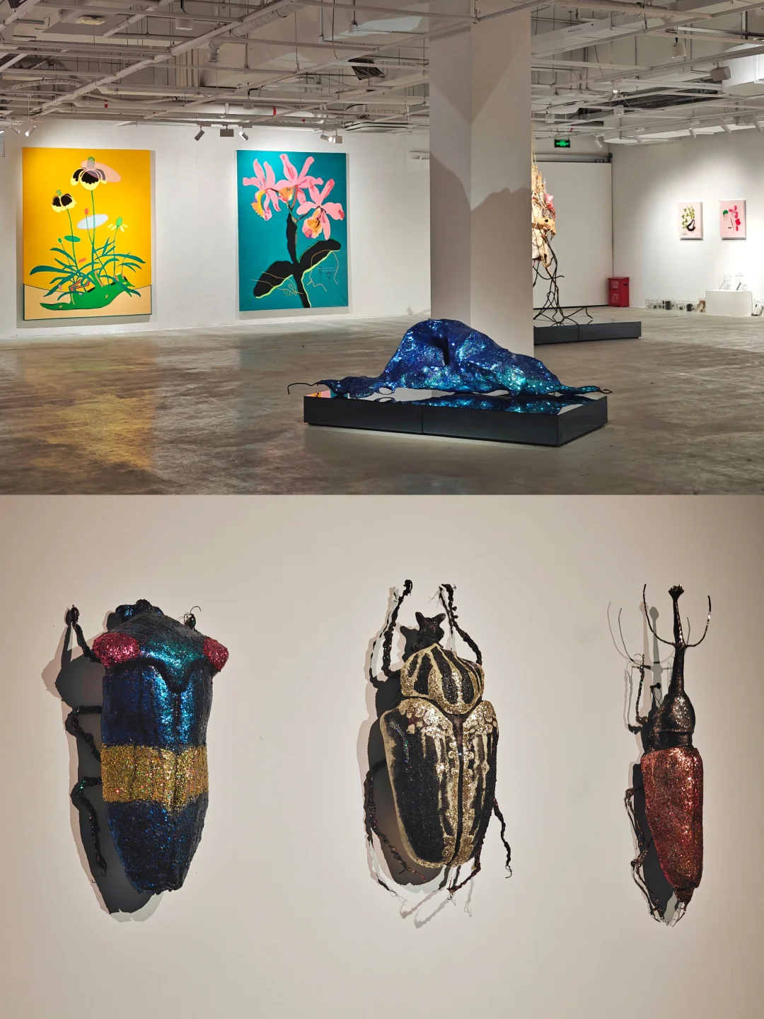 ☘️布展强化了观展的仪式感,极具视觉冲击力,多件巨型昆虫立体装置与色彩对比强烈的大画幅作品,共同构建出一个层次丰富的植物神殿。