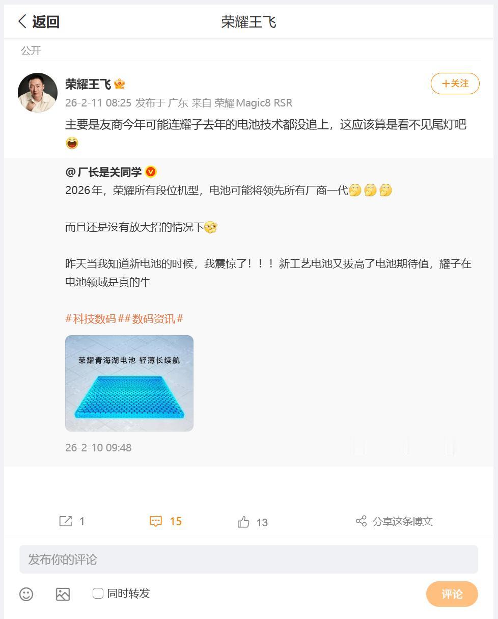 技术的进步带来的就是产品颠覆性的迭代更新,这不刚刚看到数码圈内大佬透露,荣耀青海湖电池,将要在2026年度继续领先所有厂商,新工艺电池能够做到轻薄长续航,所以荣耀新机的厚度又要轻薄不少了,对此荣耀王飞表示,荣耀电池技术的尾灯,大家很难追的上 畅聊数码新品 数码资讯