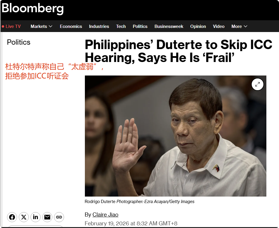 2月19日,根据彭博社的报道,菲律宾前总统杜特尔特通过律师发表一份声明,称自己现在的身体非常虚弱,无法参加下周举行的国际刑事法院预审听证会。