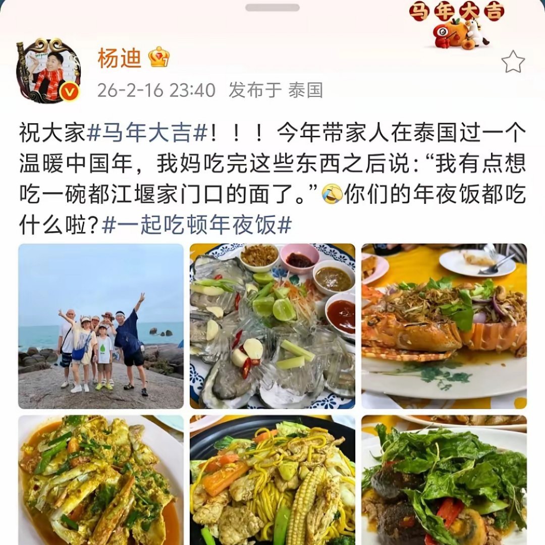 杨迪携家人在泰国过年!终于见到了和杨迪神似的外甥女。2月16日,杨迪晒出与父母、妹妹及妹妹两个孩子的合影,还表示今年是带家人在泰国过的年。