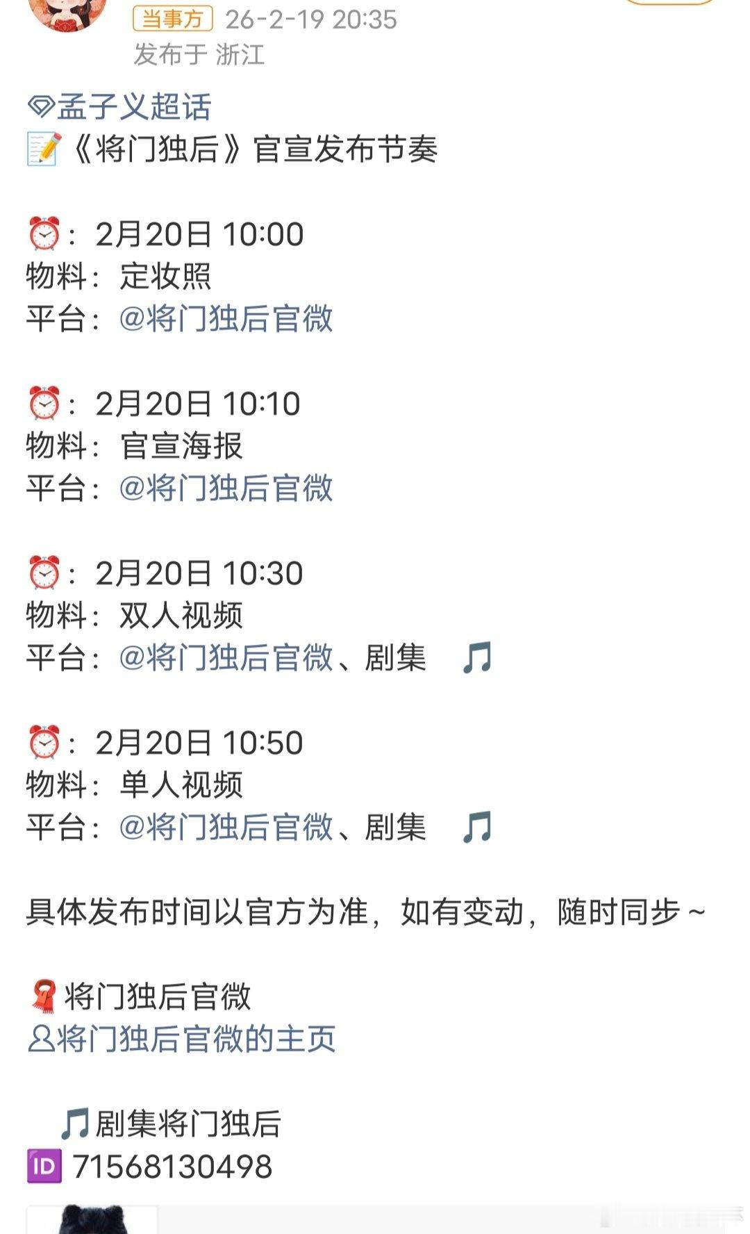 将门独后官宣节奏所以闹得这么久,板上钉钉了还是这男女主人选!将门独后原小说女主重生复仇记,男主人设苏人气高,期待明天的新剧官宣!大家更关心的是番位还是剧情的改编?