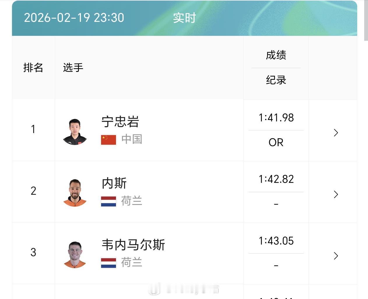 宁忠岩打破奥运记录,目前排名第一,还剩两组选手出场米兰冬奥会宁忠岩1分41秒9