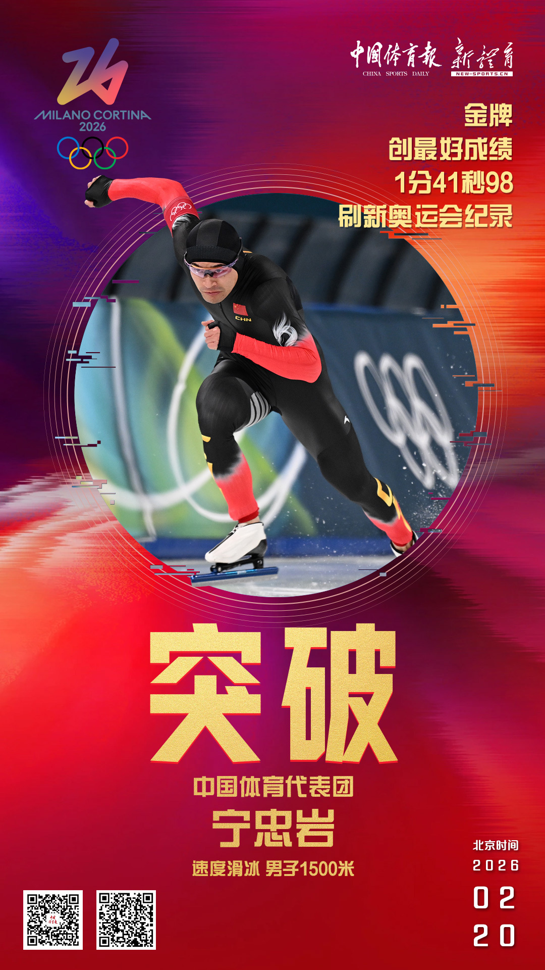 米兰冬奥会中国队第三金来了!!!宁忠岩获得米兰冬奥会速度滑冰男子1500米金牌,